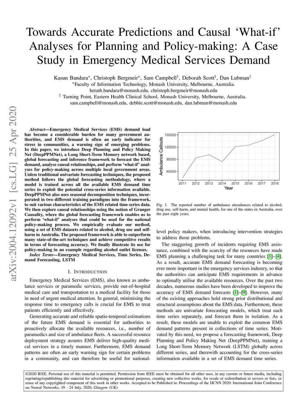 Emergency Medical Services (EMS) demand load has become a considerable burden for many government authorities, and EMS demand is often an early indicator for stress in communities, a warning sign of emerging problems. In this paper, we introduce Deep Planning and Policy Making Net (DeepPPMNet), a Long Short-Term Memory network based, global forecasting and inference framework to forecast the EMS demand, analyse causal relationships, and perform `what-if' analyses for policy-making across multiple local government areas. Unless traditional univariate forecasting techniques, the proposed method follows the global forecasting methodology, where a model is trained across all the available EMS demand time series to exploit the potential cross-series information available. DeepPPMNet also uses seasonal decomposition techniques, incorporated in two different training paradigms into the framework, to suit various characteristics of the EMS related time series data. We then explore causal relationships using the notion of Granger Causality, where the global forecasting framework enables us to perform `what-if' analyses that could be used for the national policy-making process. We empirically evaluate our method, using a set of EMS datasets related to alcohol, drug use and self-harm in Australia. The proposed framework is able to outperform many state-of-the-art techniques and achieve competitive results in terms of forecasting accuracy. We finally illustrate its use for policy-making in an example regarding alcohol outlet licenses.