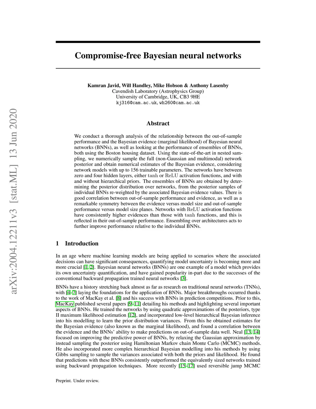 We conduct a thorough analysis of the relationship between the out-of-sample performance and the Bayesian evidence (marginal likelihood) of Bayesian neural networks (BNNs), as well as looking at the performance of ensembles of BNNs, both using the Boston housing dataset. Using the state-of-the-art in nested sampling, we numerically sample the full (non-Gaussian and multimodal) network posterior and obtain numerical estimates of the Bayesian evidence, considering network models with up to 156 trainable parameters. The networks have between zero and four hidden layers, either or activation functions, and with and without hierarchical priors. The ensembles of BNNs are obtained by determining the posterior distribution over networks, from the posterior samples of individual BNNs re-weighted by the associated Bayesian evidence values. There is good correlation between out-of-sample performance and evidence, as well as a remarkable symmetry between the evidence versus model size and out-of-sample performance versus model size planes. Networks with activation functions have consistently higher evidences than those with functions, and this is reflected in their out-of-sample performance. Ensembling over architectures acts to further improve performance relative to the individual BNNs.