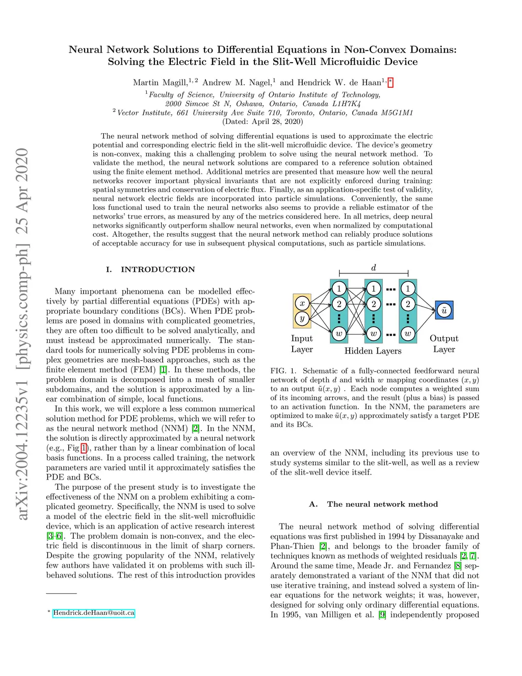 The neural network method of solving differential equations is used to approximate the electric potential and corresponding electric field in the slit-well microfluidic device. The device's geometry is non-convex, making this a challenging problem to solve using the neural network method. To validate the method, the neural network solutions are compared to a reference solution obtained using the finite element method. Additional metrics are presented that measure how well the neural networks recover important physical invariants that are not explicitly enforced during training: spatial symmetries and conservation of electric flux. Finally, as an application-specific test of validity, neural network electric fields are incorporated into particle simulations. Conveniently, the same loss functional used to train the neural networks also seems to provide a reliable estimator of the networks' true errors, as measured by any of the metrics considered here. In all metrics, deep neural networks significantly outperform shallow neural networks, even when normalized by computational cost. Altogether, the results suggest that the neural network method can reliably produce solutions of acceptable accuracy for use in subsequent physical computations, such as particle simulations.
