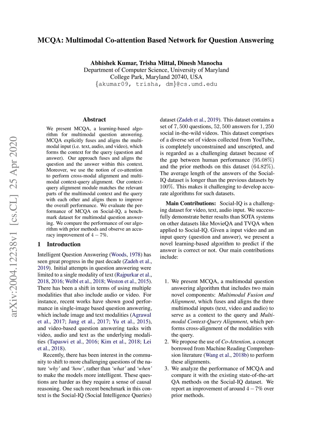 MCQA: Multimodal Co-attention Based Network for Question Answering