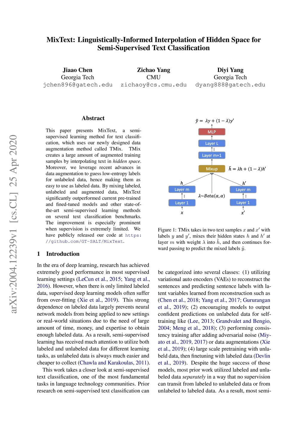 This paper presents MixText, a semi-supervised learning method for text classification, which uses our newly designed data augmentation method called TMix. TMix creates a large amount of augmented training samples by interpolating text in hidden space. Moreover, we leverage recent advances in data augmentation to guess low-entropy labels for unlabeled data, hence making them as easy to use as labeled data.By mixing labeled, unlabeled and augmented data, MixText significantly outperformed current pre-trained and fined-tuned models and other state-of-the-art semi-supervised learning methods on several text classification benchmarks. The improvement is especially prominent when supervision is extremely limited. We have publicly released our code at https://github.com/GT-SALT/MixText.