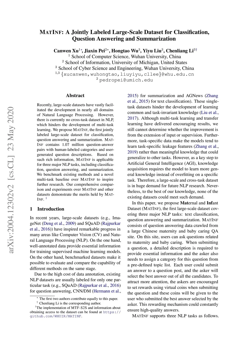 Recently, large-scale datasets have vastly facilitated the development in nearly all domains of Natural Language Processing. However, there is currently no cross-task dataset in NLP, which hinders the development of multi-task learning. We propose MATINF, the first jointly labeled large-scale dataset for classification, question answering and summarization. MATINF contains 1.07 million question-answer pairs with human-labeled categories and user-generated question descriptions. Based on such rich information, MATINF is applicable for three major NLP tasks, including classification, question answering, and summarization. We benchmark existing methods and a novel multi-task baseline over MATINF to inspire further research. Our comprehensive comparison and experiments over MATINF and other datasets demonstrate the merits held by MATINF.