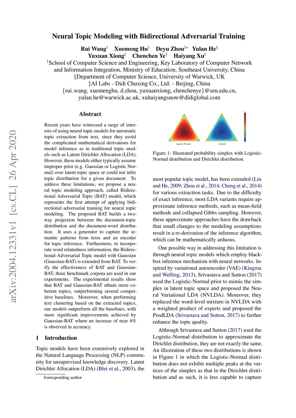 Neural Topic Modeling with Bidirectional Adversarial Training