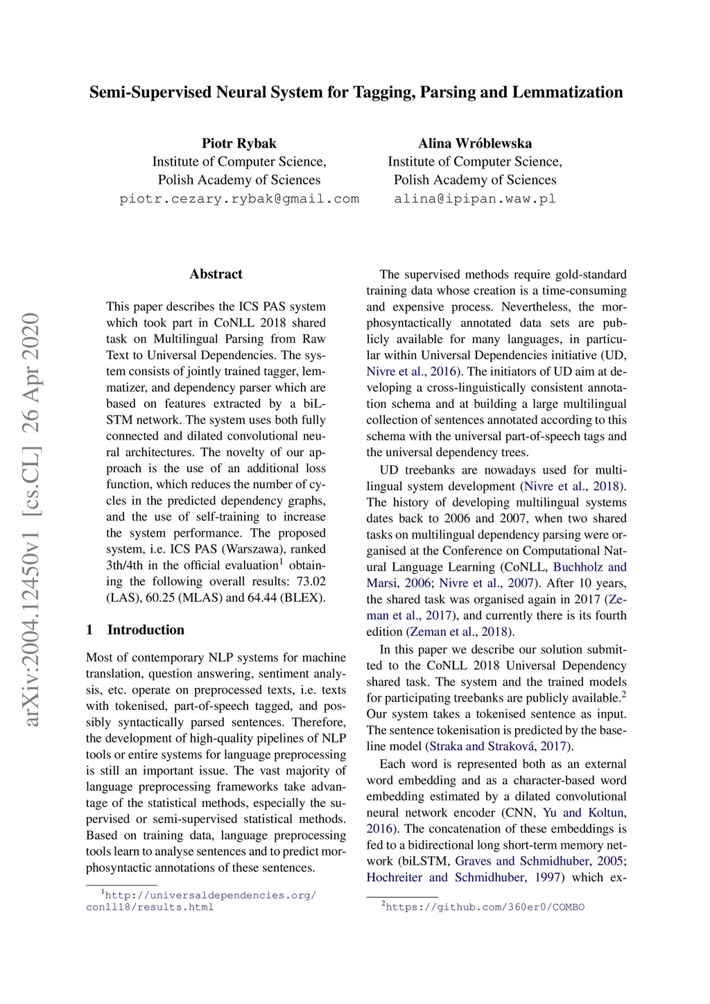 This paper describes the ICS PAS system which took part in CoNLL 2018 shared task on Multilingual Parsing from Raw Text to Universal Dependencies. The system consists of jointly trained tagger, lemmatizer, and dependency parser which are based on features extracted by a biLSTM network. The system uses both fully connected and dilated convolutional neural architectures. The novelty of our approach is the use of an additional loss function, which reduces the number of cycles in the predicted dependency graphs, and the use of self-training to increase the system performance. The proposed system, i.e. ICS PAS (Warszawa), ranked 3th/4th in the official evaluation obtaining the following overall results: 73.02 (LAS), 60.25 (MLAS) and 64.44 (BLEX).