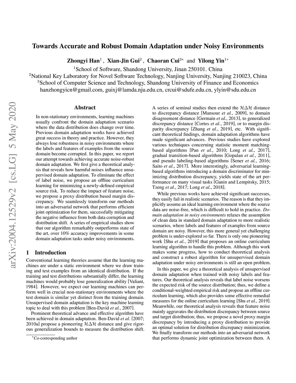 In non-stationary environments, learning machines usually confront the domain adaptation scenario where the data distribution does change over time. Previous domain adaptation works have achieved great success in theory and practice. However, they always lose robustness in noisy environments where the labels and features of examples from the source domain become corrupted. In this paper, we report our attempt towards achieving accurate noise-robust domain adaptation. We first give a theoretical analysis that reveals how harmful noises influence unsupervised domain adaptation. To eliminate the effect of label noise, we propose an offline curriculum learning for minimizing a newly-defined empirical source risk. To reduce the impact of feature noise, we propose a proxy distribution based margin discrepancy. We seamlessly transform our methods into an adversarial network that performs efficient joint optimization for them, successfully mitigating the negative influence from both data corruption and distribution shift. A series of empirical studies show that our algorithm remarkably outperforms state of the art, over 10% accuracy improvements in some domain adaptation tasks under noisy environments.