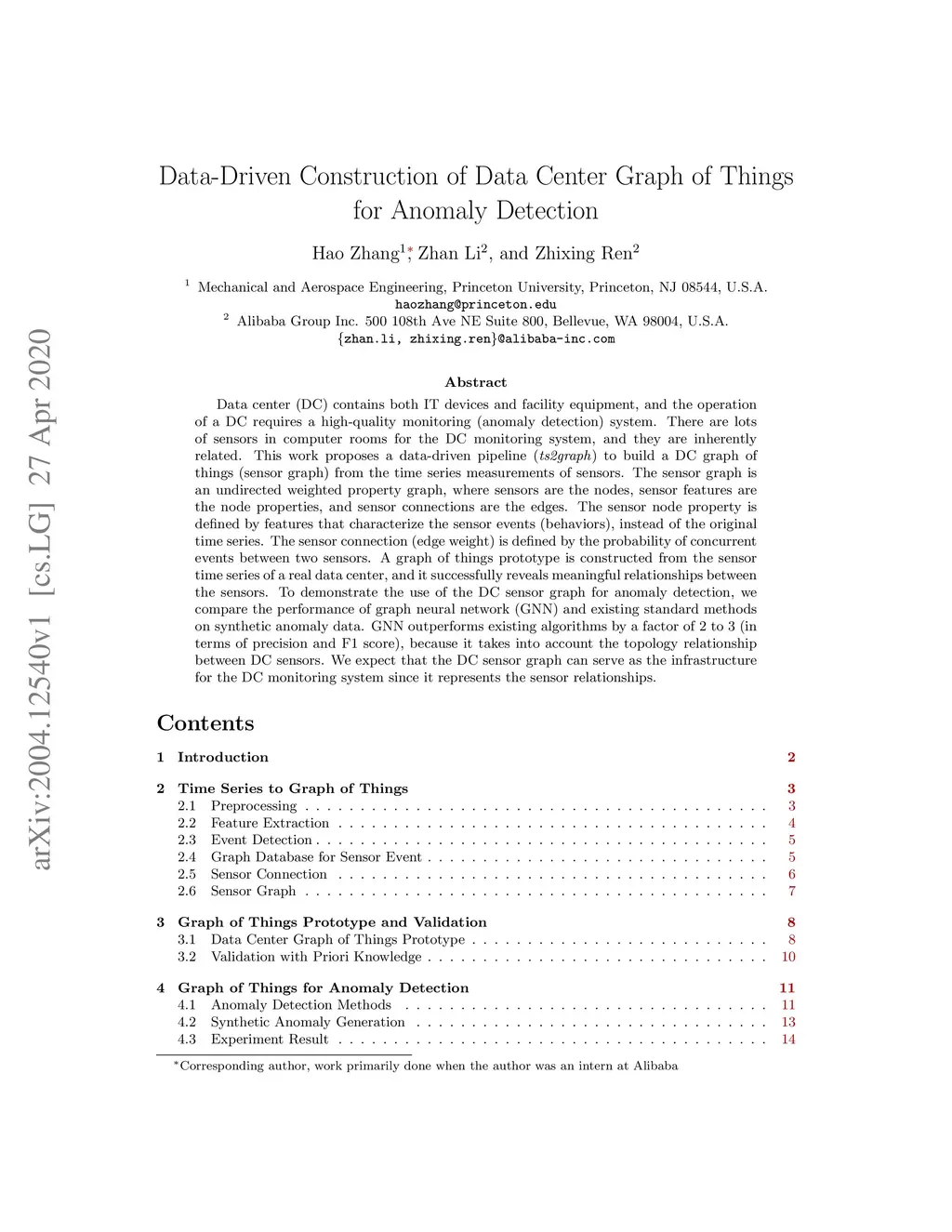 Data center (DC) contains both IT devices and facility equipment, and the operation of a DC requires a high-quality monitoring (anomaly detection) system. There are lots of sensors in computer rooms for the DC monitoring system, and they are inherently related. This work proposes a data-driven pipeline (ts2graph) to build a DC graph of things (sensor graph) from the time series measurements of sensors. The sensor graph is an undirected weighted property graph, where sensors are the nodes, sensor features are the node properties, and sensor connections are the edges. The sensor node property is defined by features that characterize the sensor events (behaviors), instead of the original time series. The sensor connection (edge weight) is defined by the probability of concurrent events between two sensors. A graph of things prototype is constructed from the sensor time series of a real data center, and it successfully reveals meaningful relationships between the sensors. To demonstrate the use of the DC sensor graph for anomaly detection, we compare the performance of graph neural network (GNN) and existing standard methods on synthetic anomaly data. GNN outperforms existing algorithms by a factor of 2 to 3 (in terms of precision and F1 score), because it takes into account the topology relationship between DC sensors. We expect that the DC sensor graph can serve as the infrastructure for the DC monitoring system since it represents the sensor relationships.