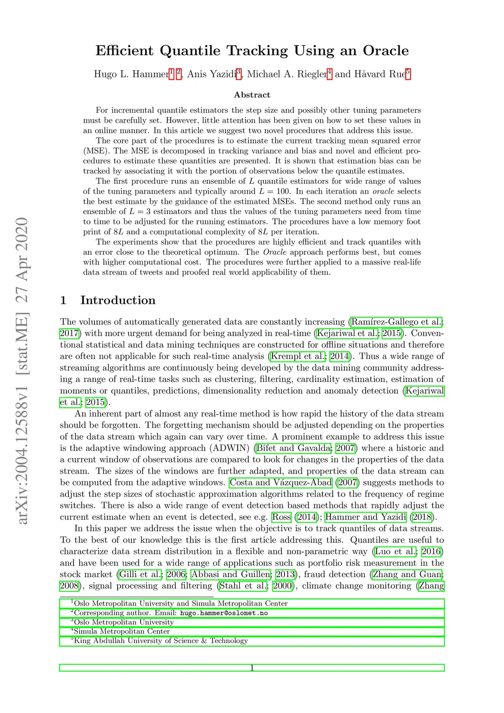 For incremental quantile estimators the step size and possibly other tuning parameters must be carefully set. However, little attention has been given on how to set these values in an online manner. In this article we suggest two novel procedures that address this issue. The core part of the procedures is to estimate the current tracking mean squared error (MSE). The MSE is decomposed in tracking variance and bias and novel and efficient procedures to estimate these quantities are presented. It is shown that estimation bias can be tracked by associating it with the portion of observations below the quantile estimates. The first procedure runs an ensemble of quantile estimators for wide range of values of the tuning parameters and typically around . In each iteration an oracle selects the best estimate by the guidance of the estimated MSEs. The second method only runs an ensemble of estimators and thus the values of the tuning parameters need from time to time to be adjusted for the running estimators. The procedures have a low memory foot print of and a computational complexity of per iteration. The experiments show that the procedures are highly efficient and track quantiles with an error close to the theoretical optimum. The Oracle approach performs best, but comes with higher computational cost. The procedures were further applied to a massive real-life data stream of tweets and proofed real world applicability of them.