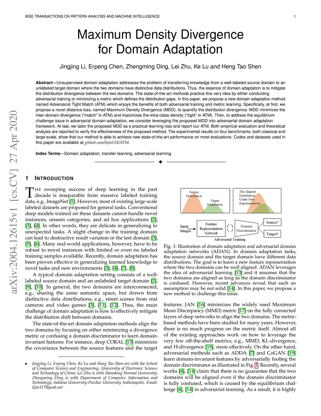 Unsupervised domain adaptation addresses the problem of transferring knowledge from a well-labeled source domain to an unlabeled target domain where the two domains have distinctive data distributions. Thus, the essence of domain adaptation is to mitigate the distribution divergence between the two domains. The state-of-the-art methods practice this very idea by either conducting adversarial training or minimizing a metric which defines the distribution gaps. In this paper, we propose a new domain adaptation method named Adversarial Tight Match (ATM) which enjoys the benefits of both adversarial training and metric learning. Specifically, at first, we propose a novel distance loss, named Maximum Density Divergence (MDD), to quantify the distribution divergence. MDD minimizes the inter-domain divergence ("match" in ATM) and maximizes the intra-class density ("tight" in ATM). Then, to address the equilibrium challenge issue in adversarial domain adaptation, we consider leveraging the proposed MDD into adversarial domain adaptation framework. At last, we tailor the proposed MDD as a practical learning loss and report our ATM. Both empirical evaluation and theoretical analysis are reported to verify the effectiveness of the proposed method. The experimental results on four benchmarks, both classical and large-scale, show that our method is able to achieve new state-of-the-art performance on most evaluations. Codes and datasets used in this paper are available at {\it github.com/lijin118/ATM}.