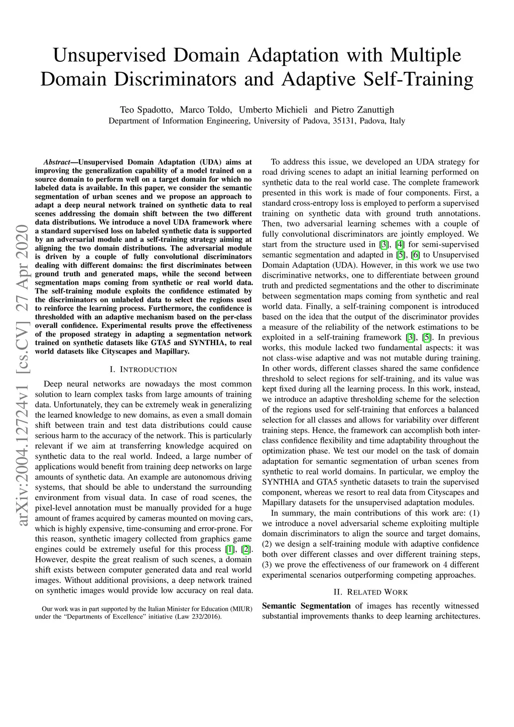 Unsupervised Domain Adaptation (UDA) aims at improving the generalization capability of a model trained on a source domain to perform well on a target domain for which no labeled data is available. In this paper, we consider the semantic segmentation of urban scenes and we propose an approach to adapt a deep neural network trained on synthetic data to real scenes addressing the domain shift between the two different data distributions. We introduce a novel UDA framework where a standard supervised loss on labeled synthetic data is supported by an adversarial module and a self-training strategy aiming at aligning the two domain distributions. The adversarial module is driven by a couple of fully convolutional discriminators dealing with different domains: the first discriminates between ground truth and generated maps, while the second between segmentation maps coming from synthetic or real world data. The self-training module exploits the confidence estimated by the discriminators on unlabeled data to select the regions used to reinforce the learning process. Furthermore, the confidence is thresholded with an adaptive mechanism based on the per-class overall confidence. Experimental results prove the effectiveness of the proposed strategy in adapting a segmentation network trained on synthetic datasets like GTA5 and SYNTHIA, to real world datasets like Cityscapes and Mapillary.