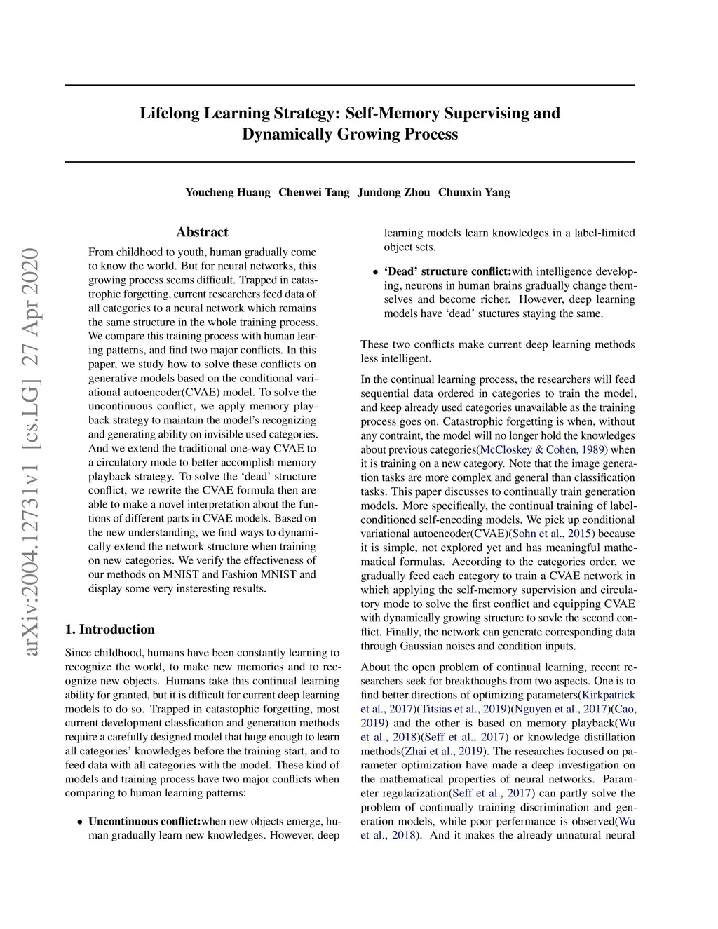 From childhood to youth, human gradually come to know the world. But for neural networks, this growing process seems difficult. Trapped in catastrophic forgetting, current researchers feed data of all categories to a neural network which remains the same structure in the whole training process. We compare this training process with human learing patterns, and find two major conflicts. In this paper, we study how to solve these conflicts on generative models based on the conditional variational autoencoder(CVAE) model. To solve the uncontinuous conflict, we apply memory playback strategy to maintain the model's recognizing and generating ability on invisible used categories. And we extend the traditional one-way CVAE to a circulatory mode to better accomplish memory playback strategy. To solve the `dead' structure conflict, we rewrite the CVAE formula then are able to make a novel interpretation about the funtions of different parts in CVAE models. Based on the new understanding, we find ways to dynamically extend the network structure when training on new categories. We verify the effectiveness of our methods on MNIST and Fashion MNIST and display some very insteresting results.