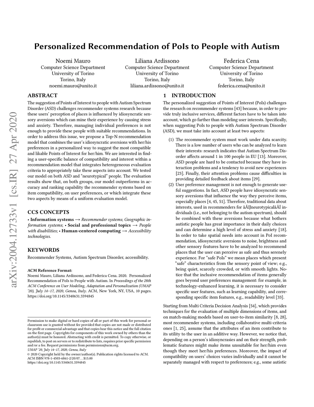 The suggestion of Points of Interest to people with Autism Spectrum Disorder (ASD) challenges recommender systems research because these users' perception of places is influenced by idiosyncratic sensory aversions which can mine their experience by causing stress and anxiety. Therefore, managing individual preferences is not enough to provide these people with suitable recommendations. In order to address this issue, we propose a Top-N recommendation model that combines the user's idiosyncratic aversions with her/his preferences in a personalized way to suggest the most compatible and likable Points of Interest for her/him. We are interested in finding a user-specific balance of compatibility and interest within a recommendation model that integrates heterogeneous evaluation criteria to appropriately take these aspects into account. We tested our model on both ASD and "neurotypical" people. The evaluation results show that, on both groups, our model outperforms in accuracy and ranking capability the recommender systems based on item compatibility, on user preferences, or which integrate these two aspects by means of a uniform evaluation model.