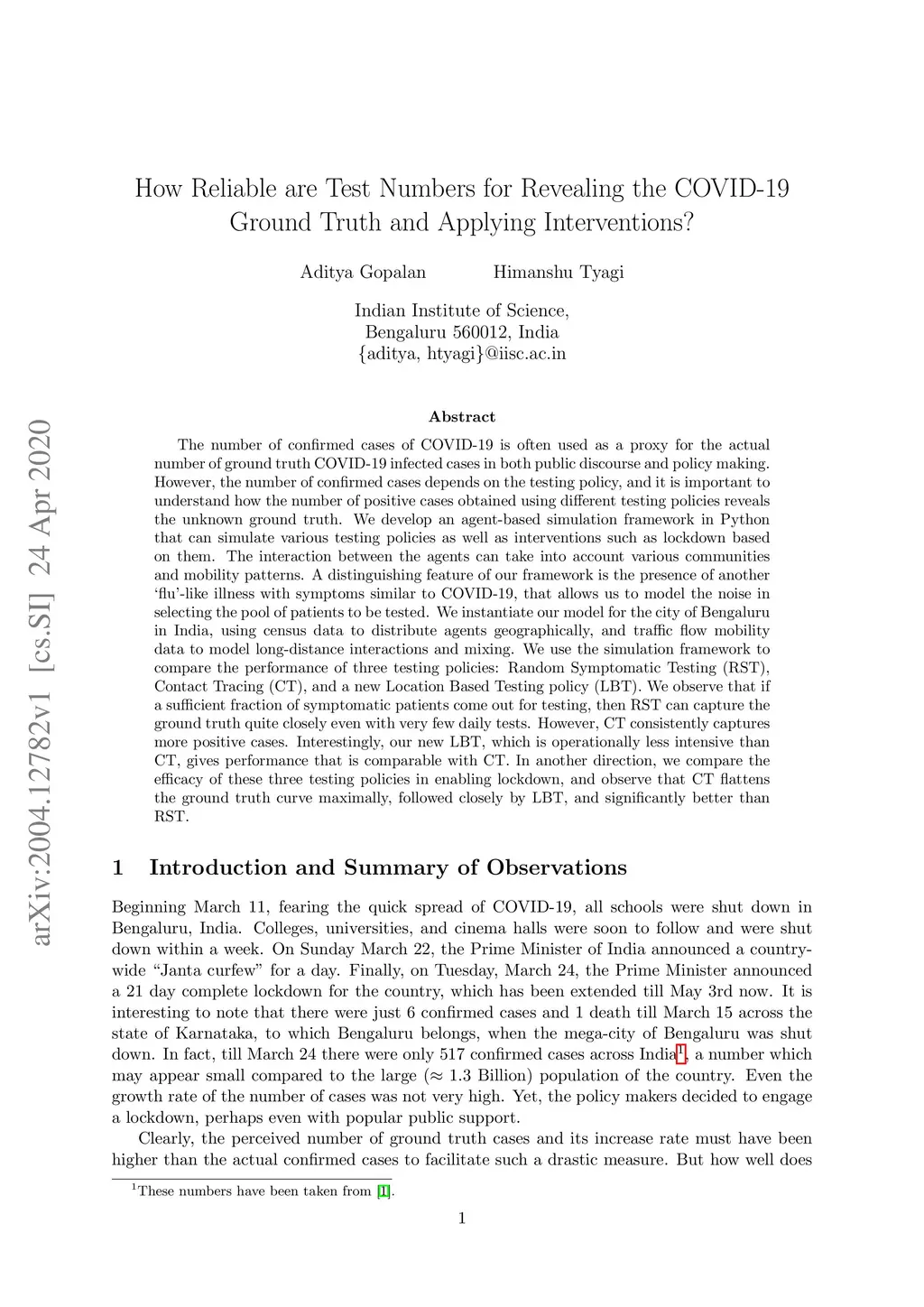 The number of confirmed cases of COVID-19 is often used as a proxy for the actual number of ground truth COVID-19 infected cases in both public discourse and policy making. However, the number of confirmed cases depends on the testing policy, and it is important to understand how the number of positive cases obtained using different testing policies reveals the unknown ground truth. We develop an agent-based simulation framework in Python that can simulate various testing policies as well as interventions such as lockdown based on them. The interaction between the agents can take into account various communities and mobility patterns. A distinguishing feature of our framework is the presence of another `flu'-like illness with symptoms similar to COVID-19, that allows us to model the noise in selecting the pool of patients to be tested. We instantiate our model for the city of Bengaluru in India, using census data to distribute agents geographically, and traffic flow mobility data to model long-distance interactions and mixing. We use the simulation framework to compare the performance of three testing policies: Random Symptomatic Testing (RST), Contact Tracing (CT), and a new Location Based Testing policy (LBT). We observe that if a sufficient fraction of symptomatic patients come out for testing, then RST can capture the ground truth quite closely even with very few daily tests. However, CT consistently captures more positive cases. Interestingly, our new LBT, which is operationally less intensive than CT, gives performance that is comparable with CT. In another direction, we compare the efficacy of these three testing policies in enabling lockdown, and observe that CT flattens the ground truth curve maximally, followed closely by LBT, and significantly better than RST.