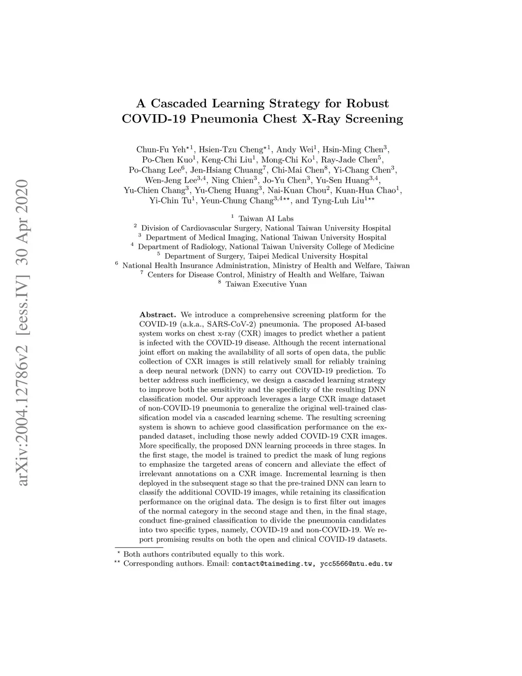 We introduce a comprehensive screening platform for the COVID-19 (a.k.a., SARS-CoV-2) pneumonia. The proposed AI-based system works on chest x-ray (CXR) images to predict whether a patient is infected with the COVID-19 disease. Although the recent international joint effort on making the availability of all sorts of open data, the public collection of CXR images is still relatively small for reliably training a deep neural network (DNN) to carry out COVID-19 prediction. To better address such inefficiency, we design a cascaded learning strategy to improve both the sensitivity and the specificity of the resulting DNN classification model. Our approach leverages a large CXR image dataset of non-COVID-19 pneumonia to generalize the original well-trained classification model via a cascaded learning scheme. The resulting screening system is shown to achieve good classification performance on the expanded dataset, including those newly added COVID-19 CXR images.