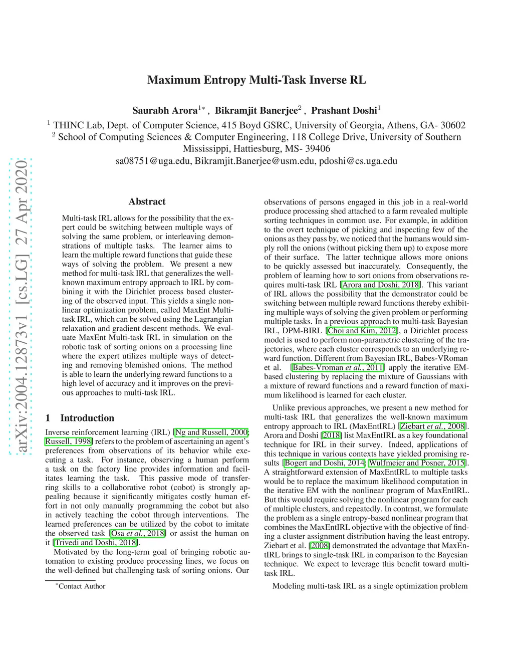 Multi-task IRL allows for the possibility that the expert could be switching between multiple ways of solving the same problem, or interleaving demonstrations of multiple tasks. The learner aims to learn the multiple reward functions that guide these ways of solving the problem. We present a new method for multi-task IRL that generalizes the well-known maximum entropy approach to IRL by combining it with the Dirichlet process based clustering of the observed input. This yields a single nonlinear optimization problem, called MaxEnt Multi-task IRL, which can be solved using the Lagrangian relaxation and gradient descent methods. We evaluate MaxEnt Multi-task IRL in simulation on the robotic task of sorting onions on a processing line where the expert utilizes multiple ways of detecting and removing blemished onions. The method is able to learn the underlying reward functions to a high level of accuracy and it improves on the previous approaches to multi-task IRL.