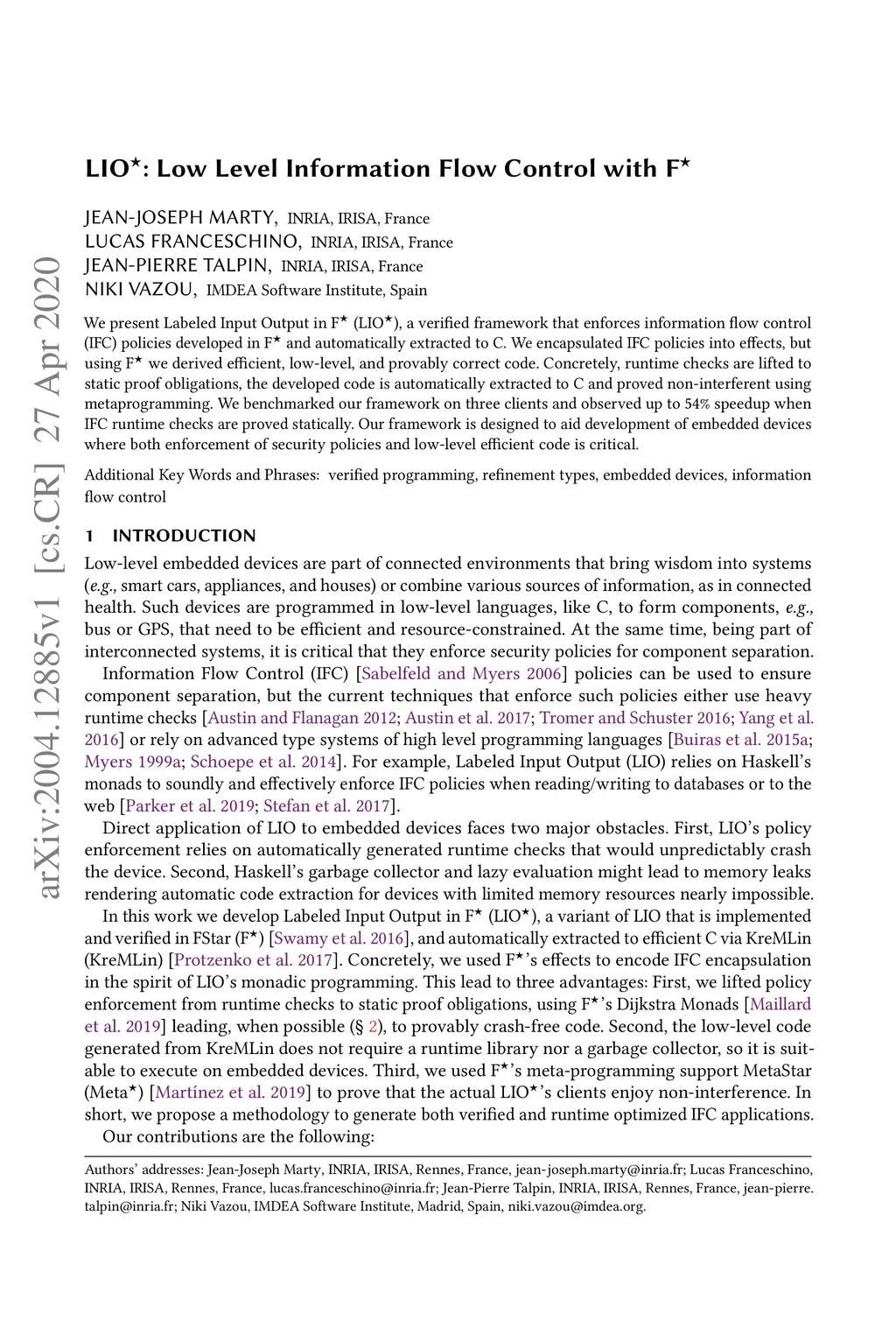 We present Labeled Input Output in F* (LIO*), a verified framework that enforces information flow control (IFC) policies developed in F* and automatically extracted to C. Inspired by LIO, we encapsulated IFC policies into effects, but using F* we derived efficient, low level, and provably correct code. Concretely, runtime checks are lifted to static proof obligations, the developed code is automatically extracted to C and proved non-interferent using metaprogramming. We benchmarked our framework on three clients and observed up to 54% speedup when IFC runtime checks are proved statically. Our framework is designed to aid development of embedded devices where both enforcement of security policies and low level efficient code is critical.