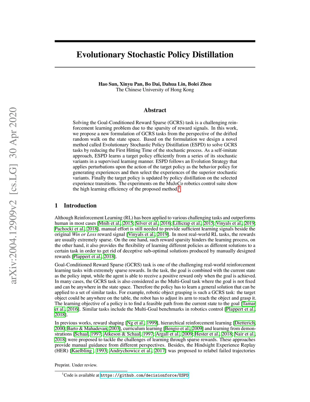 Solving the Goal-Conditioned Reward Sparse (GCRS) task is a challenging reinforcement learning problem due to the sparsity of reward signals. In this work, we propose a new formulation of GCRS tasks from the perspective of the drifted random walk on the state space, and design a novel method called Evolutionary Stochastic Policy Distillation (ESPD) to solve them based on the insight of reducing the First Hitting Time of the stochastic process. As a self-imitate approach, ESPD enables a target policy to learn from a series of its stochastic variants through the technique of policy distillation (PD). The learning mechanism of ESPD can be considered as an Evolution Strategy (ES) that applies perturbations upon policy directly on the action space, with a SELECT function to check the superiority of stochastic variants and then use PD to update the policy. The experiments based on the MuJoCo robotics control suite show the high learning efficiency of the proposed method.