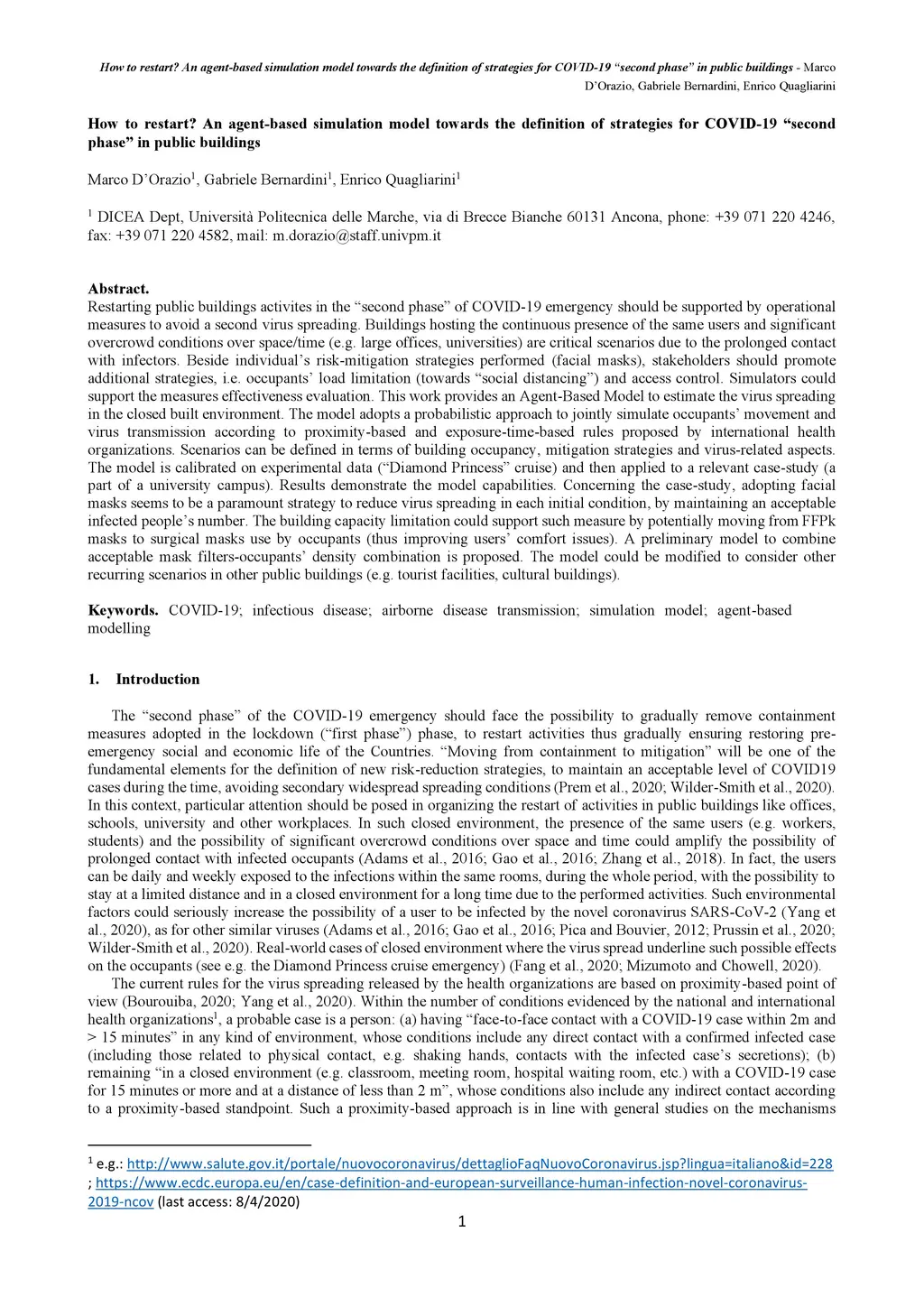 Restarting public buildings activities in the "second phase" of COVID-19 emergency should be supported by operational measures to avoid a second virus spreading. Buildings hosting the continuous presence of the same users and significant overcrowd conditions over space/time (e.g. large offices, universities) are critical scenarios due to the prolonged contact with infectors. Beside individual's risk-mitigation strategies performed (facial masks), stakeholders should promote additional strategies, i.e. occupants' load limitation (towards "social distancing") and access control. Simulators could support the measures effectiveness evaluation. This work provides an Agent-Based Model to estimate the virus spreading in the closed built environment. The model adopts a probabilistic approach to jointly simulate occupants' movement and virus transmission according to proximity-based and exposure-time-based rules proposed by international health organizations. Scenarios can be defined in terms of building occupancy, mitigation strategies and virus-related aspects. The model is calibrated on experimental data ("Diamond Princess" cruise) and then applied to a relevant case-study (a part of a university campus). Results demonstrate the model capabilities. Concerning the case-study, adopting facial masks seems to be a paramount strategy to reduce virus spreading in each initial condition, by maintaining an acceptable infected people's number. The building capacity limitation could support such measure by potentially moving from FFPk masks to surgical masks use by occupants (thus improving users' comfort issues). A preliminary model to combine acceptable mask filters-occupants' density combination is proposed. The model could be modified to consider other recurring scenarios in other public buildings (e.g. tourist facilities, cultural buildings).