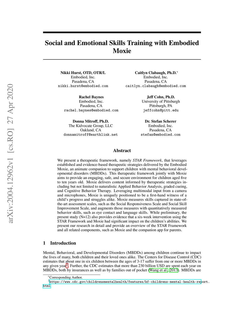 We present a therapeutic framework, namely STAR Framework, that leverages established and evidence-based therapeutic strategies delivered by the Embodied Moxie, an animate companion to support children with mental behavioral developmental disorders (MBDDs). This therapeutic framework jointly with Moxie aims to provide an engaging, safe, and secure environment for children aged five to ten years old. Moxie delivers content informed by therapeutic strategies including but not limited to naturalistic Applied Behavior Analysis, graded cueing, and Cognitive Behavior Therapy. Leveraging multimodal input from a camera and microphones, Moxie is uniquely positioned to be a first-hand witness of a child's progress and struggles alike. Moxie measures skills captured in state-of-the-art assessment scales, such as the Social Responsiveness Scale and Social Skill Improvement Scale, and augments those measures with quantitatively measured behavior skills, such as eye contact and language skills. While preliminary, the present study (N=12) also provides evidence that a six-week intervention using the STAR Framework and Moxie had significant impact on the children's abilities. We present our research in detail and provide an overview of the STAR Framework and all related components, such as Moxie and the companion app for parents.