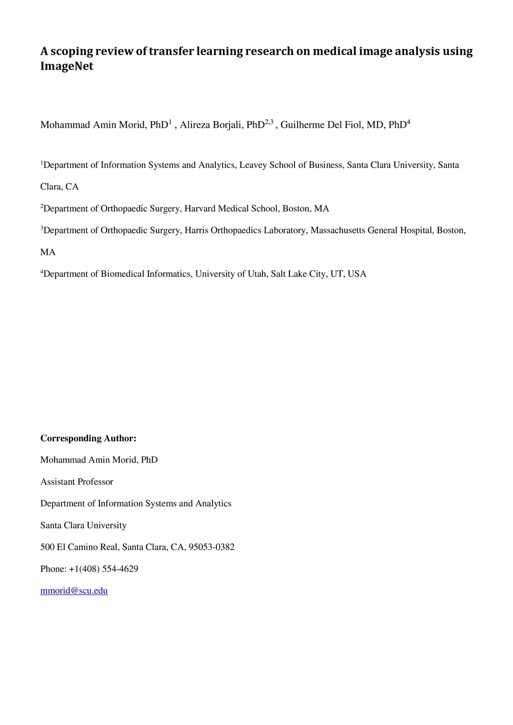 Objective: Employing transfer learning (TL) with convolutional neural networks (CNNs), well-trained on non-medical ImageNet dataset, has shown promising results for medical image analysis in recent years. We aimed to conduct a scoping review to identify these studies and summarize their characteristics in terms of the problem description, input, methodology, and outcome. Materials and Methods: To identify relevant studies, MEDLINE, IEEE, and ACM digital library were searched. Two investigators independently reviewed articles to determine eligibility and to extract data according to a study protocol defined a priori. Results: After screening of 8,421 articles, 102 met the inclusion criteria. Of 22 anatomical areas, eye (18%), breast (14%), and brain (12%) were the most commonly studied. Data augmentation was performed in 72% of fine-tuning TL studies versus 15% of the feature-extracting TL studies. Inception models were the most commonly used in breast related studies (50%), while VGGNet was the common in eye (44%), skin (50%) and tooth (57%) studies. AlexNet for brain (42%) and DenseNet for lung studies (38%) were the most frequently used models. Inception models were the most frequently used for studies that analyzed ultrasound (55%), endoscopy (57%), and skeletal system X-rays (57%). VGGNet was the most common for fundus (42%) and optical coherence tomography images (50%). AlexNet was the most frequent model for brain MRIs (36%) and breast X-Rays (50%). 35% of the studies compared their model with other well-trained CNN models and 33% of them provided visualization for interpretation. Discussion: This study identified the most prevalent tracks of implementation in the literature for data preparation, methodology selection and output evaluation for medical image analysis. Also, we identified several critical research gaps existing in the TL studies on medical image analysis.