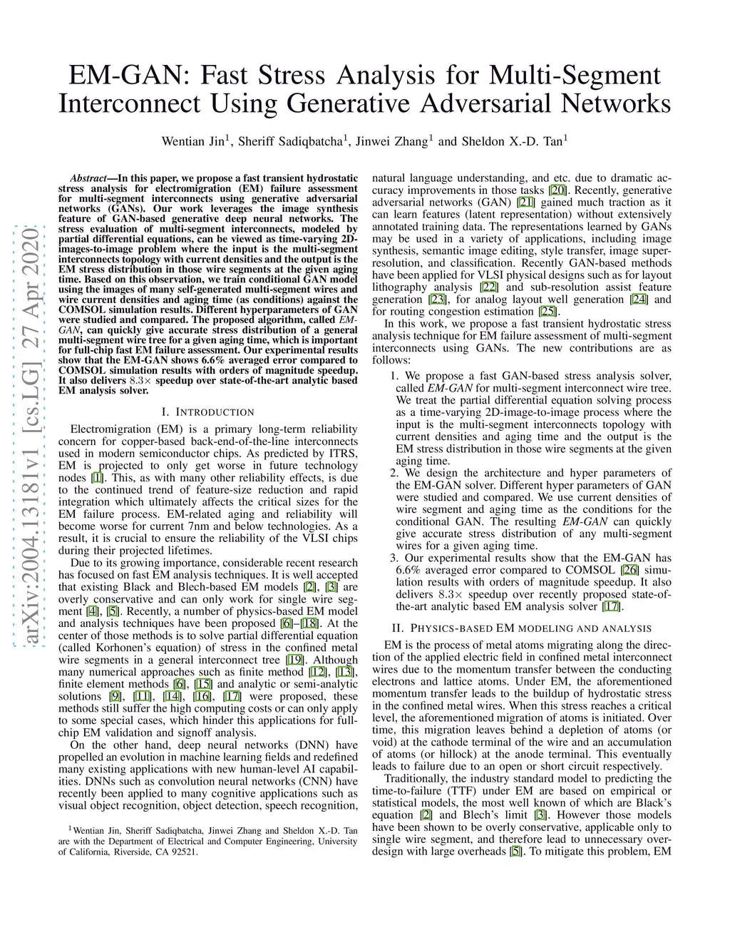 EM-GAN: Fast Stress Analysis for Multi-Segment Interconnect Using