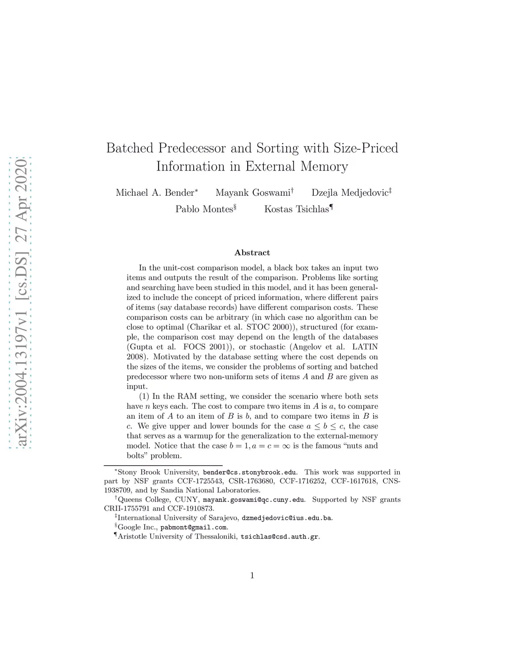 In the unit-cost comparison model, a black box takes an input two items and outputs the result of the comparison. Problems like sorting and searching have been studied in this model, and it has been generalized to include the concept of priced information, where different pairs of items (say database records) have different comparison costs. These comparison costs can be arbitrary (in which case no algorithm can be close to optimal (Charikar et al. STOC 2000)), structured (for example, the comparison cost may depend on the length of the databases (Gupta et al. FOCS 2001)), or stochastic (Angelov et al. LATIN 2008). Motivated by the database setting where the cost depends on the sizes of the items, we consider the problems of sorting and batched predecessor where two non-uniform sets of items and are given as input. (1) In the RAM setting, we consider the scenario where both sets have keys each. The cost to compare two items in is , to compare an item of to an item of is , and to compare two items in is . We give upper and lower bounds for the case . Notice that the case is the famous ``nuts and bolts'' problem. (2) In the Disk-Access Model (DAM), where transferring elements between disk and internal memory is the main bottleneck, we consider the scenario where elements in are larger than elements in . The larger items take more I/Os to be brought into memory, consume more space in internal memory, and are required in their entirety for comparisons. We first give output-sensitive lower and upper bounds on the batched predecessor problem, and use these to derive bounds on the complexity of sorting in the two models. Our bounds are tight in most cases, and require novel generalizations of the classical lower bound techniques in external memory to accommodate the non-uniformity of keys.
