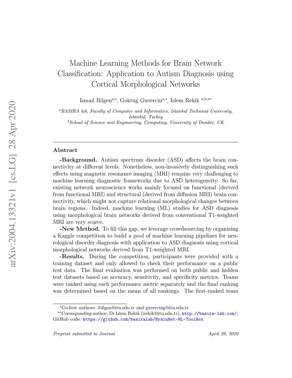 Autism spectrum disorder (ASD) affects the brain connectivity at different levels. Nonetheless, non-invasively distinguishing such effects using magnetic resonance imaging (MRI) remains very challenging to machine learning diagnostic frameworks due to ASD heterogeneity. So far, existing network neuroscience works mainly focused on functional (derived from functional MRI) and structural (derived from diffusion MRI) brain connectivity, which might not capture relational morphological changes between brain regions. Indeed, machine learning (ML) studies for ASD diagnosis using morphological brain networks derived from conventional T1-weighted MRI are very scarce. To fill this gap, we leverage crowdsourcing by organizing a Kaggle competition to build a pool of machine learning pipelines for neurological disorder diagnosis with application to ASD diagnosis using cortical morphological networks derived from T1-weighted MRI. During the competition, participants were provided with a training dataset and only allowed to check their performance on a public test data. The final evaluation was performed on both public and hidden test datasets based on accuracy, sensitivity, and specificity metrics. Teams were ranked using each performance metric separately and the final ranking was determined based on the mean of all rankings. The first-ranked team achieved 70% accuracy, 72.5% sensitivity, and 67.5% specificity, while the second-ranked team achieved 63.8%, 62.5%, 65% respectively. Leveraging participants to design ML diagnostic methods within a competitive machine learning setting has allowed the exploration and benchmarking of wide spectrum of ML methods for ASD diagnosis using cortical morphological networks.