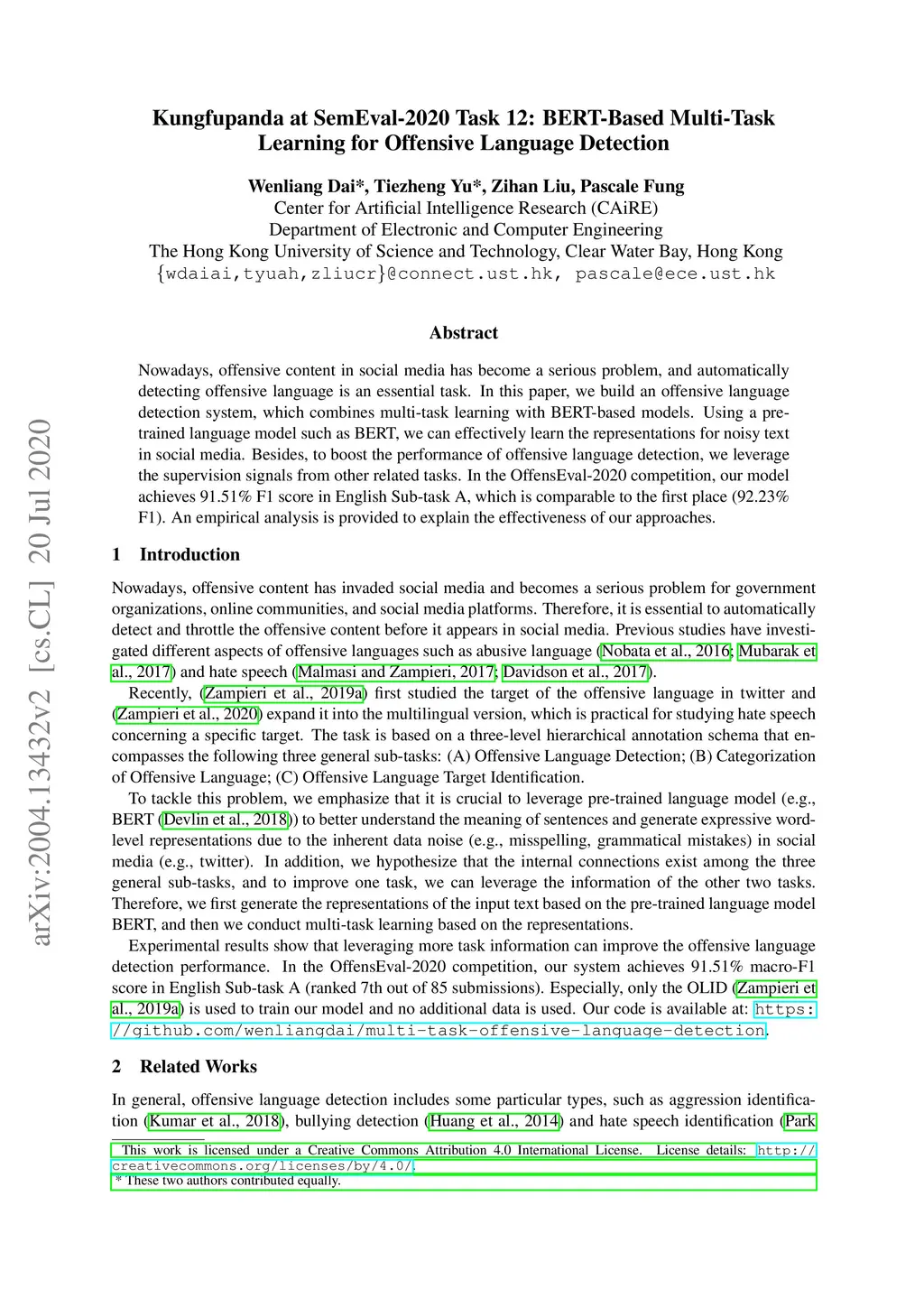 Kungfupanda at SemEval-2020 Task 12: BERT-Based Multi-Task Learning for