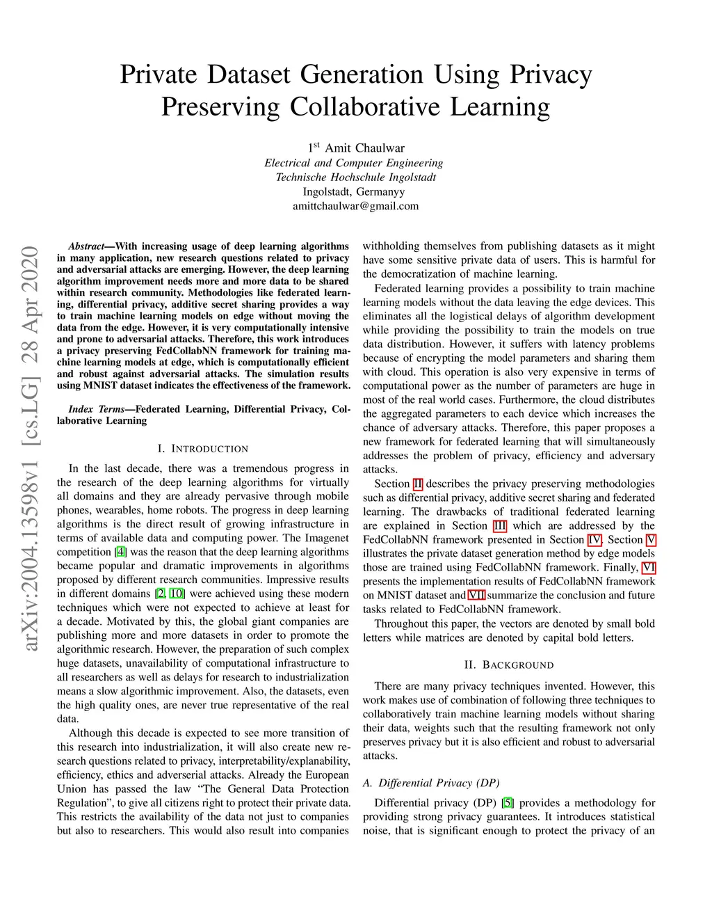 Private Dataset Generation Using Privacy Preserving Collaborative