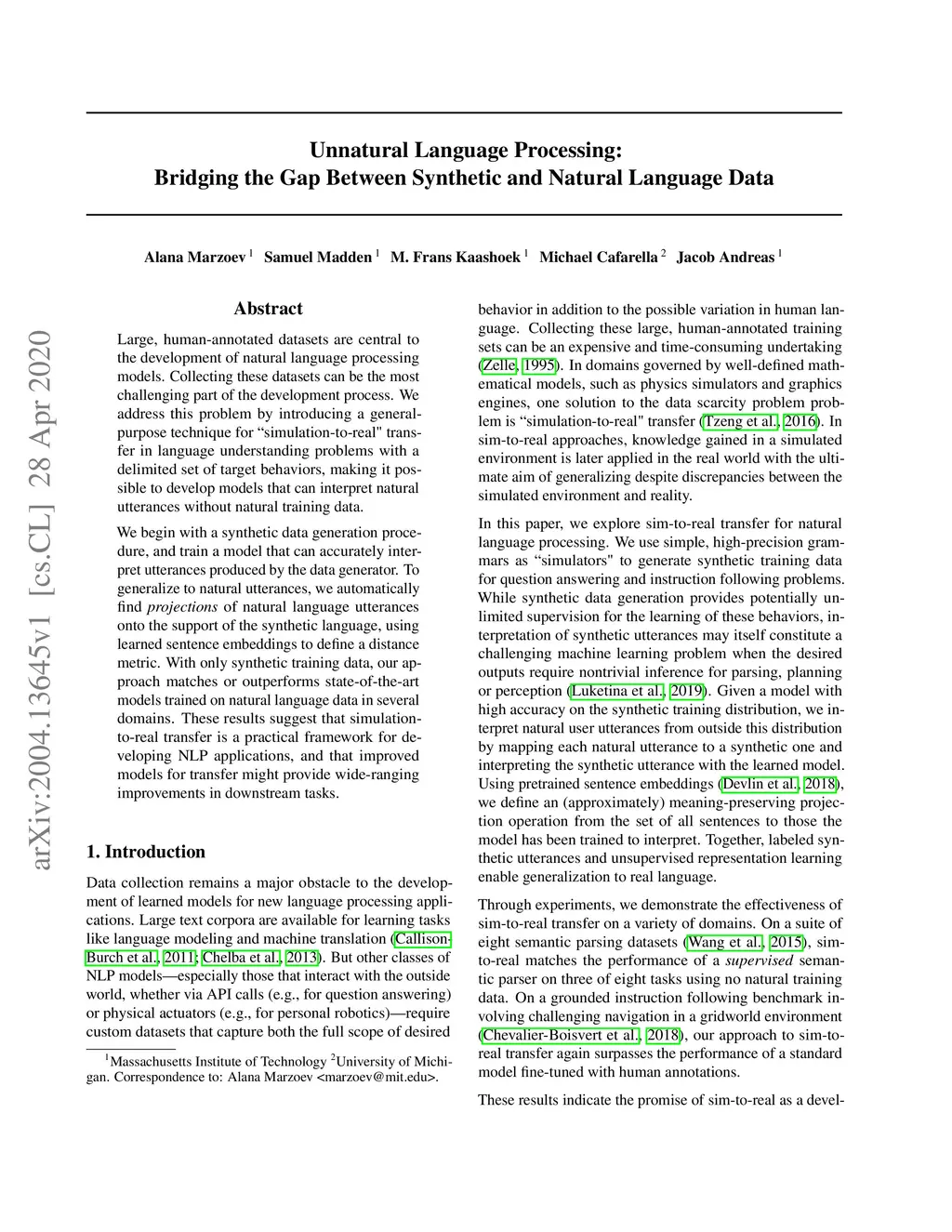 Large, human-annotated datasets are central to the development of natural language processing models. Collecting these datasets can be the most challenging part of the development process. We address this problem by introducing a general purpose technique for ``simulation-to-real'' transfer in language understanding problems with a delimited set of target behaviors, making it possible to develop models that can interpret natural utterances without natural training data. We begin with a synthetic data generation procedure, and train a model that can accurately interpret utterances produced by the data generator. To generalize to natural utterances, we automatically find projections of natural language utterances onto the support of the synthetic language, using learned sentence embeddings to define a distance metric. With only synthetic training data, our approach matches or outperforms state-of-the-art models trained on natural language data in several domains. These results suggest that simulation-to-real transfer is a practical framework for developing NLP applications, and that improved models for transfer might provide wide-ranging improvements in downstream tasks.