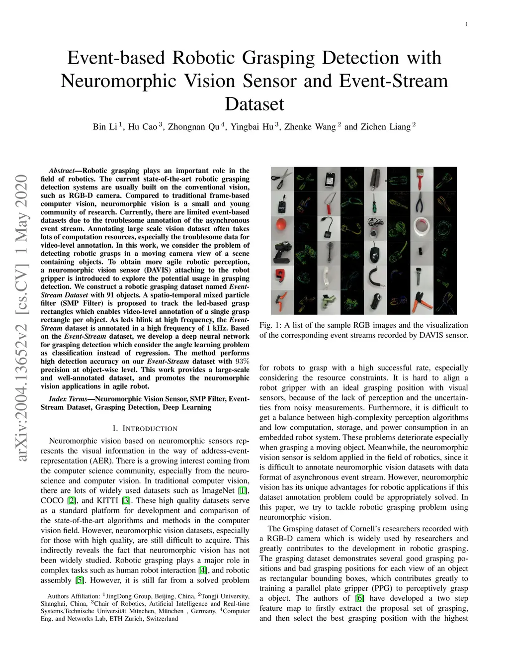 Robotic grasping plays an important role in the field of robotics. The current state-of-the-art robotic grasping detection systems are usually built on the conventional vision, such as RGB-D camera. Compared to traditional frame-based computer vision, neuromorphic vision is a small and young community of research. Currently, there are limited event-based datasets due to the troublesome annotation of the asynchronous event stream. Annotating large scale vision dataset often takes lots of computation resources, especially the troublesome data for video-level annotation. In this work, we consider the problem of detecting robotic grasps in a moving camera view of a scene containing objects. To obtain more agile robotic perception, a neuromorphic vision sensor (DAVIS) attaching to the robot gripper is introduced to explore the potential usage in grasping detection. We construct a robotic grasping dataset named Event-Stream Dataset with 91 objects. A spatio-temporal mixed particle filter (SMP Filter) is proposed to track the led-based grasp rectangles which enables video-level annotation of a single grasp rectangle per object. As leds blink at high frequency, the Event-Stream dataset is annotated in a high frequency of 1 kHz. Based on the Event-Stream dataset, we develop a deep neural network for grasping detection which consider the angle learning problem as classification instead of regression. The method performs high detection accuracy on our Event-Stream dataset with 93% precision at object-wise level. This work provides a large-scale and well-annotated dataset, and promotes the neuromorphic vision applications in agile robot.