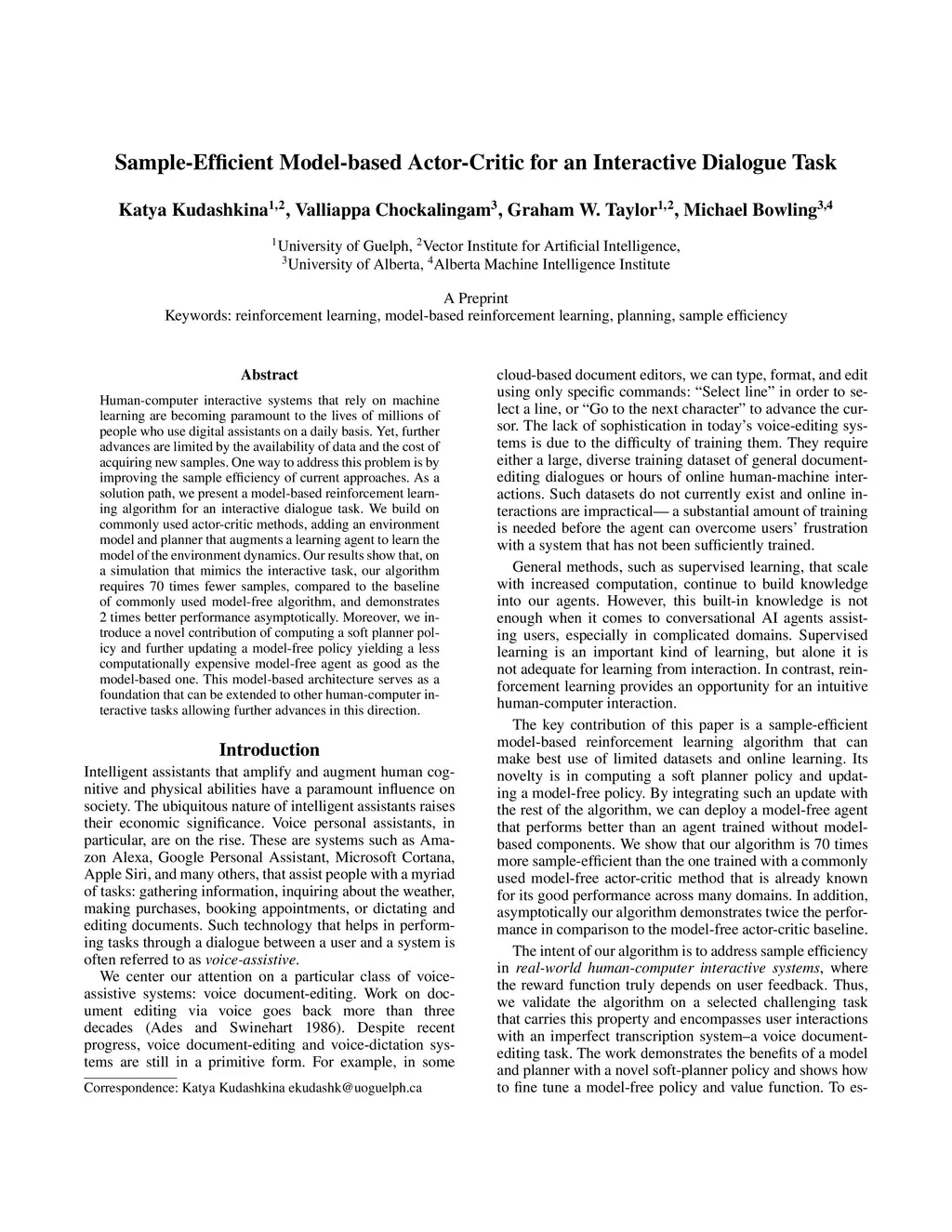 Sample-Efficient Model-based Actor-Critic for an Interactive Dialogue