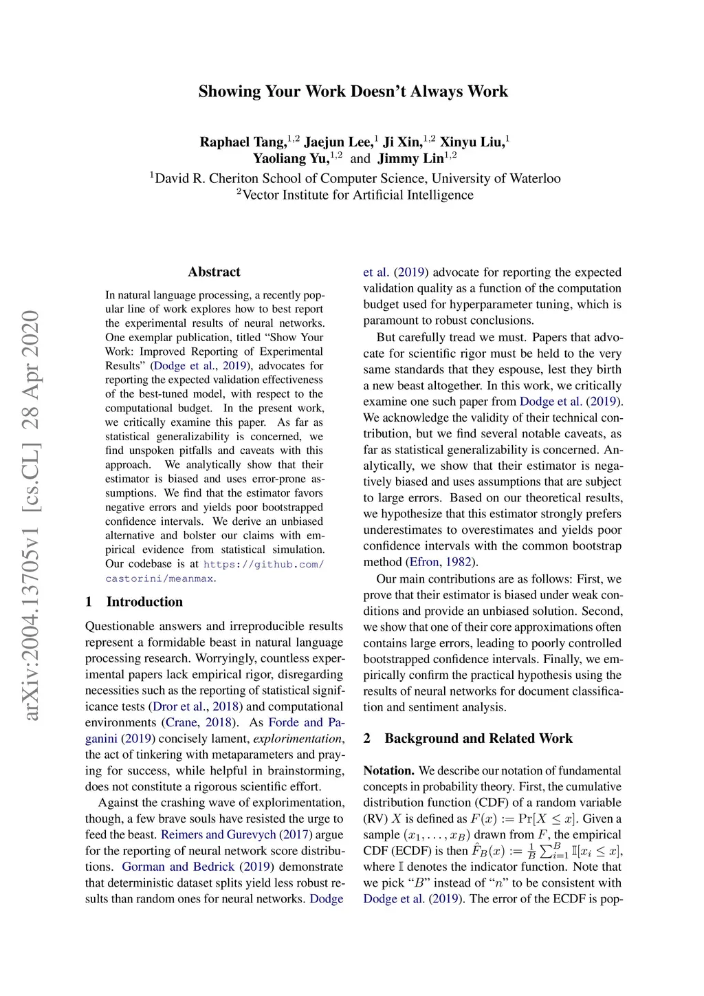 In natural language processing, a recently popular line of work explores how to best report the experimental results of neural networks. One exemplar publication, titled "Show Your Work: Improved Reporting of Experimental Results," advocates for reporting the expected validation effectiveness of the best-tuned model, with respect to the computational budget. In the present work, we critically examine this paper. As far as statistical generalizability is concerned, we find unspoken pitfalls and caveats with this approach. We analytically show that their estimator is biased and uses error-prone assumptions. We find that the estimator favors negative errors and yields poor bootstrapped confidence intervals. We derive an unbiased alternative and bolster our claims with empirical evidence from statistical simulation. Our codebase is at http://github.com/castorini/meanmax.