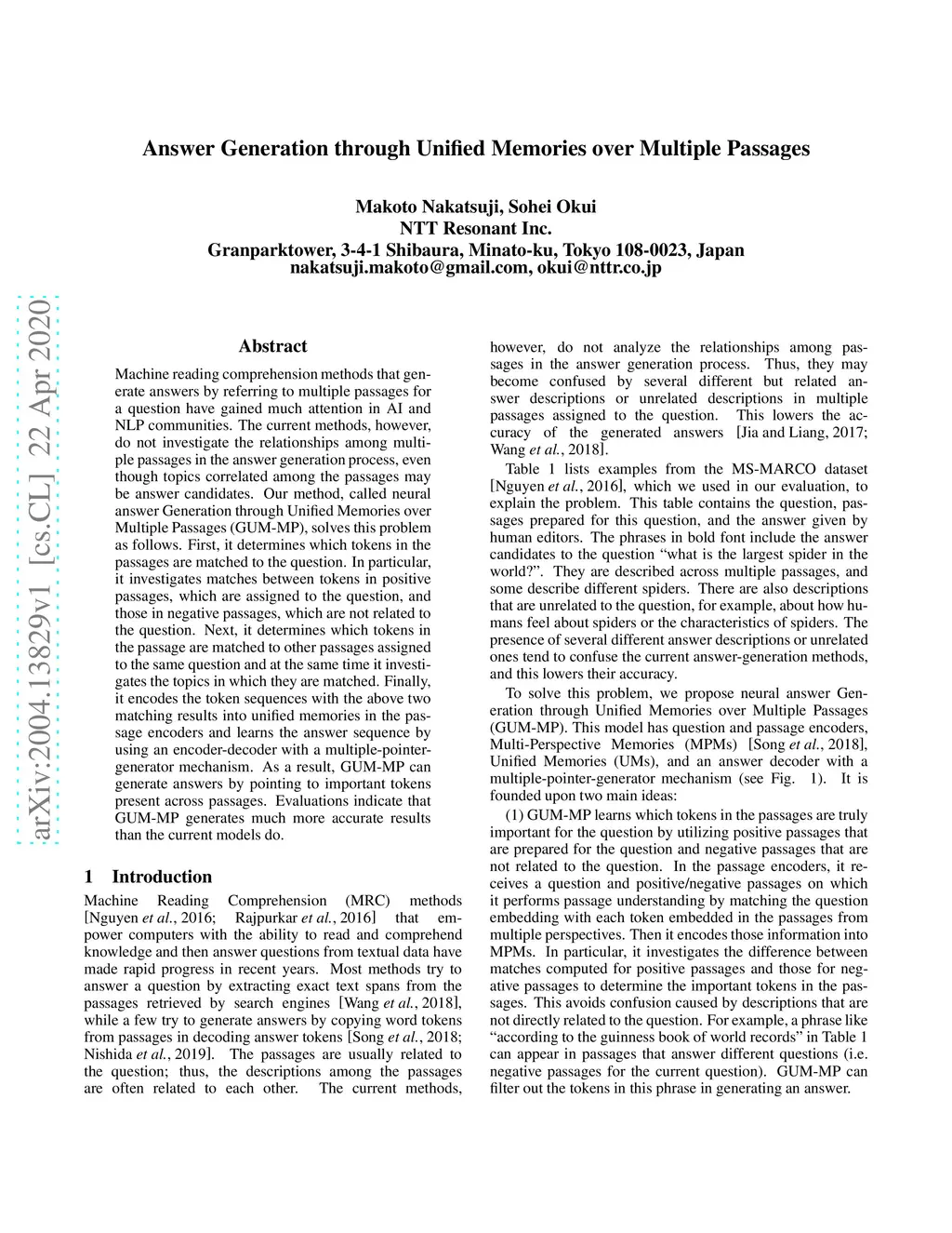 Answer Generation through Unified Memories over Multiple Passages