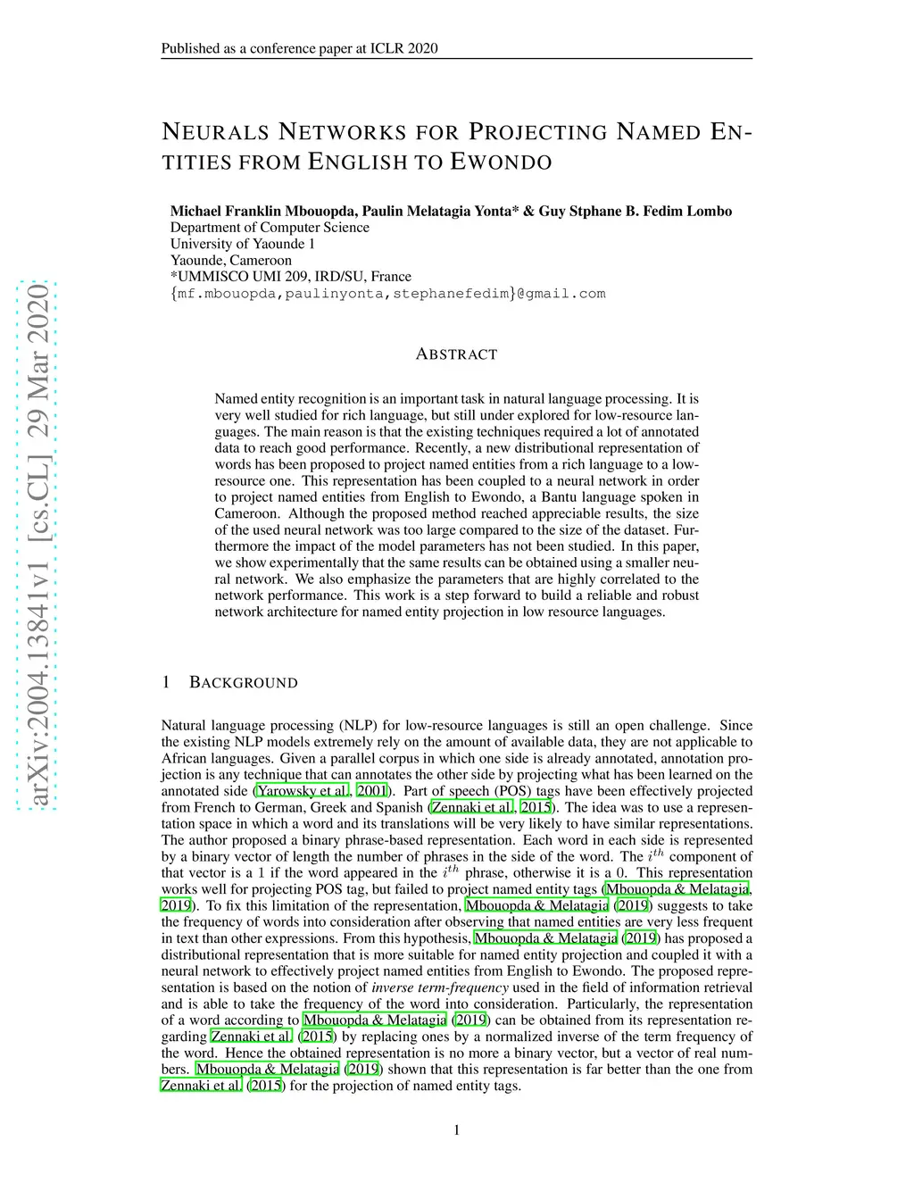 Neurals Networks for Projecting Named Entities from English to Ewondo