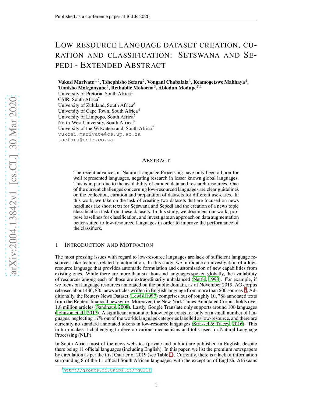 The recent advances in Natural Language Processing have only been a boon for well represented languages, negating research in lesser known global languages. This is in part due to the availability of curated data and research resources. One of the current challenges concerning low-resourced languages are clear guidelines on the collection, curation and preparation of datasets for different use-cases. In this work, we take on the task of creating two datasets that are focused on news headlines (i.e short text) for Setswana and Sepedi and the creation of a news topic classification task from these datasets. In this study, we document our work, propose baselines for classification, and investigate an approach on data augmentation better suited to low-resourced languages in order to improve the performance of the classifiers.