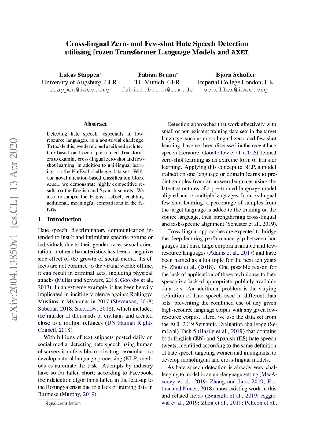 Detecting hate speech, especially in low-resource languages, is a non-trivial challenge. To tackle this, we developed a tailored architecture based on frozen, pre-trained Transformers to examine cross-lingual zero-shot and few-shot learning, in addition to uni-lingual learning, on the HatEval challenge data set. With our novel attention-based classification block AXEL, we demonstrate highly competitive results on the English and Spanish subsets. We also re-sample the English subset, enabling additional, meaningful comparisons in the future.