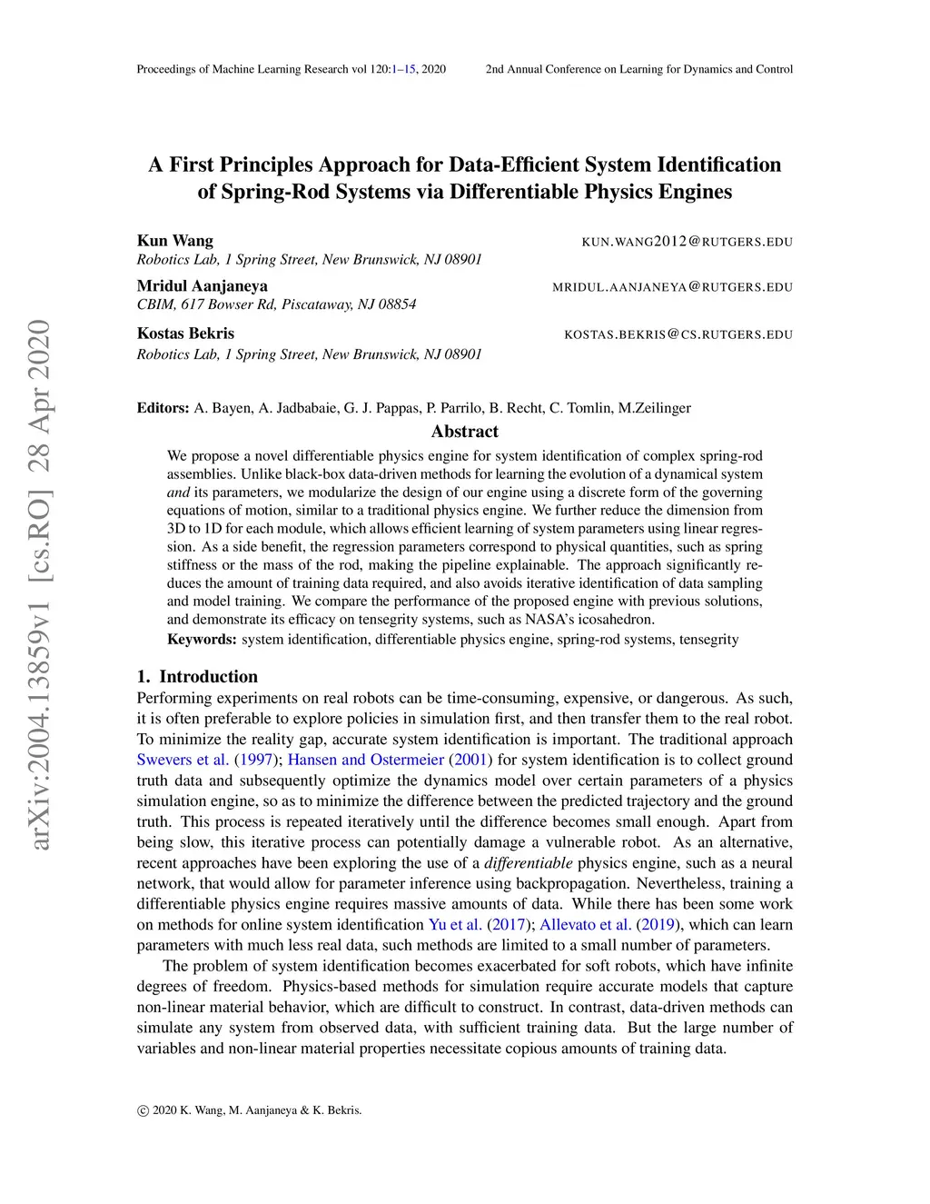 We propose a novel differentiable physics engine for system identification of complex spring-rod assemblies. Unlike black-box data-driven methods for learning the evolution of a dynamical system and its parameters, we modularize the design of our engine using a discrete form of the governing equations of motion, similar to a traditional physics engine. We further reduce the dimension from 3D to 1D for each module, which allows efficient learning of system parameters using linear regression. As a side benefit, the regression parameters correspond to physical quantities, such as spring stiffness or the mass of the rod, making the pipeline explainable. The approach significantly reduces the amount of training data required, and also avoids iterative identification of data sampling and model training. We compare the performance of the proposed engine with previous solutions, and demonstrate its efficacy on tensegrity systems, such as NASA's icosahedron.
