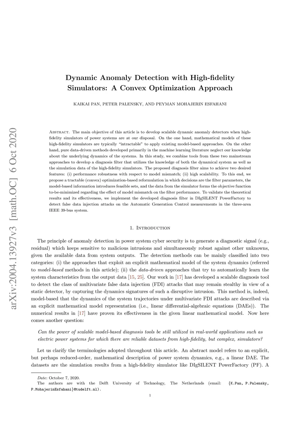 The main objective of this article is to develop scalable dynamic anomaly detectors when high-fidelity simulators of power systems are at our disposal. On the one hand, mathematical models of these high-fidelity simulators are typically "intractable" to apply existing model-based approaches. On the other hand, pure data-driven methods developed primarily in the machine learning literature neglect our knowledge about the underlying dynamics of the systems. In this study, we combine tools from these two mainstream approaches to develop a diagnosis filter that utilizes the knowledge of both the dynamical system as well as the simulation data of the high-fidelity simulators. The proposed diagnosis filter aims to achieve two desired features: (i) performance robustness with respect to model mismatch; (ii) high scalability. To this end, we propose a tractable (convex) optimization-based reformulation in which decisions are the filter parameters, the model-based information introduces feasible sets, and the data from the simulator forms the objective function to-be-minimized regarding the effect of model mismatch on the filter performance. To validate the theoretical results, we implement the developed diagnosis filter in DIgSILENT PowerFactory to detect false data injection attacks on the Automatic Generation Control measurements in the three-area IEEE 39-bus system.