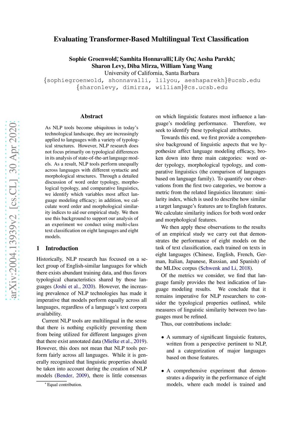 As NLP tools become ubiquitous in today's technological landscape, they are increasingly applied to languages with a variety of typological structures. However, NLP research does not focus primarily on typological differences in its analysis of state-of-the-art language models. As a result, NLP tools perform unequally across languages with different syntactic and morphological structures. Through a detailed discussion of word order typology, morphological typology, and comparative linguistics, we identify which variables most affect language modeling efficacy; in addition, we calculate word order and morphological similarity indices to aid our empirical study. We then use this background to support our analysis of an experiment we conduct using multi-class text classification on eight languages and eight models.