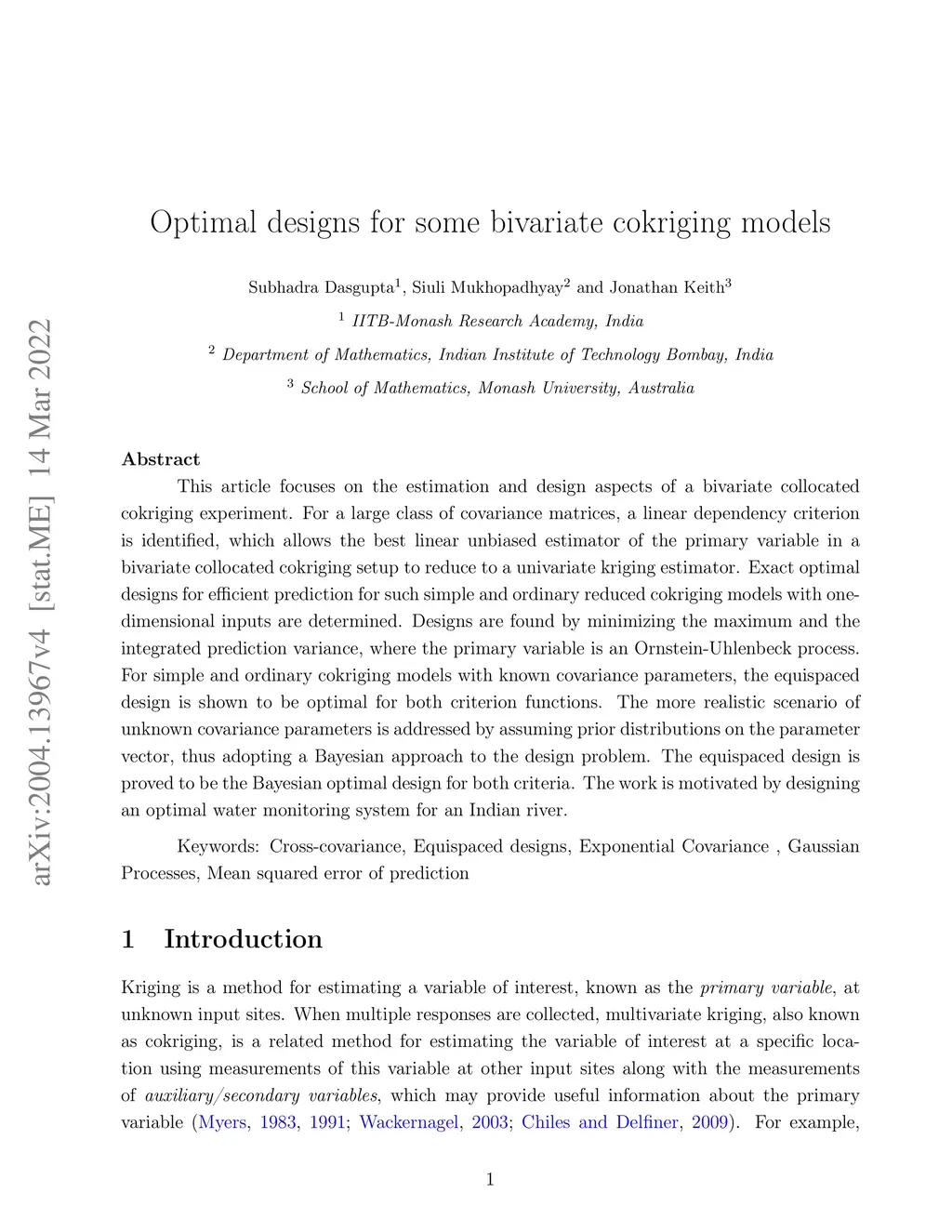 This article focuses on the estimation and design aspects of a bivariate collocated cokriging experiment. For a large class of covariance matrices, a linear dependency criterion is identified, which allows the best linear unbiased estimator of the primary variable in a bivariate collocated cokriging setup to reduce to a univariate kriging estimator. Exact optimal designs for efficient prediction for such simple and ordinary reduced cokriging models with one-dimensional inputs are determined. Designs are found by minimizing the maximum and the integrated prediction variance, where the primary variable is an Ornstein-Uhlenbeck process. For simple and ordinary cokriging models with known covariance parameters, the equispaced design is shown to be optimal for both criterion functions. The more realistic scenario of unknown covariance parameters is addressed by assuming prior distributions on the parameter vector, thus adopting a Bayesian approach to the design problem. The equispaced design is proved to be the Bayesian optimal design for both criteria. The work is motivated by designing an optimal water monitoring system for an Indian river.