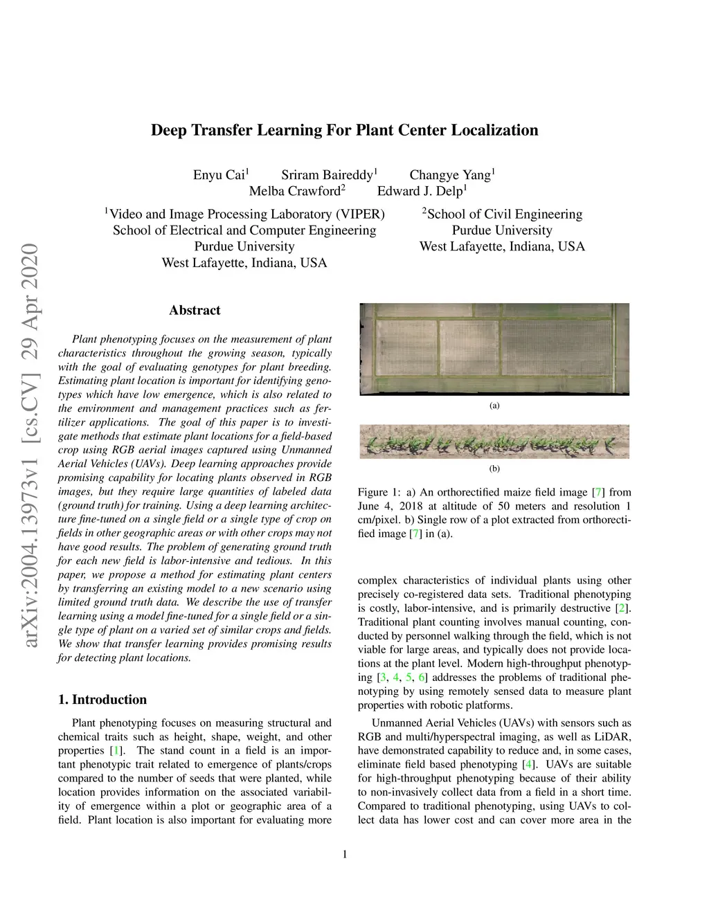 Plant phenotyping focuses on the measurement of plant characteristics throughout the growing season, typically with the goal of evaluating genotypes for plant breeding. Estimating plant location is important for identifying genotypes which have low emergence, which is also related to the environment and management practices such as fertilizer applications. The goal of this paper is to investigate methods that estimate plant locations for a field-based crop using RGB aerial images captured using Unmanned Aerial Vehicles (UAVs). Deep learning approaches provide promising capability for locating plants observed in RGB images, but they require large quantities of labeled data (ground truth) for training. Using a deep learning architecture fine-tuned on a single field or a single type of crop on fields in other geographic areas or with other crops may not have good results. The problem of generating ground truth for each new field is labor-intensive and tedious. In this paper, we propose a method for estimating plant centers by transferring an existing model to a new scenario using limited ground truth data. We describe the use of transfer learning using a model fine-tuned for a single field or a single type of plant on a varied set of similar crops and fields. We show that transfer learning provides promising results for detecting plant locations.