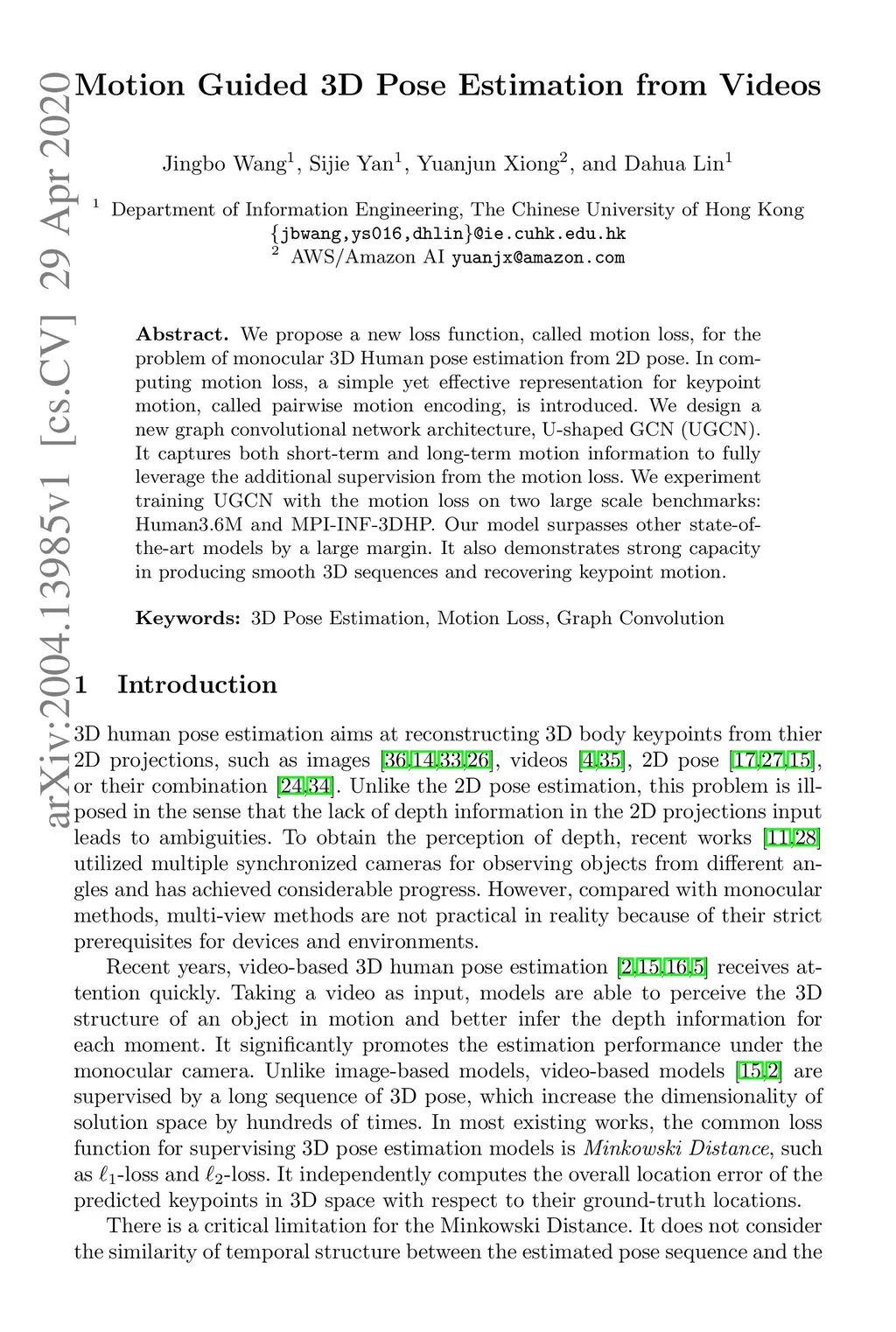 We propose a new loss function, called motion loss, for the problem of monocular 3D Human pose estimation from 2D pose. In computing motion loss, a simple yet effective representation for keypoint motion, called pairwise motion encoding, is introduced. We design a new graph convolutional network architecture, U-shaped GCN (UGCN). It captures both short-term and long-term motion information to fully leverage the additional supervision from the motion loss. We experiment training UGCN with the motion loss on two large scale benchmarks: Human3.6M and MPI-INF-3DHP. Our model surpasses other state-of-the-art models by a large margin. It also demonstrates strong capacity in producing smooth 3D sequences and recovering keypoint motion.