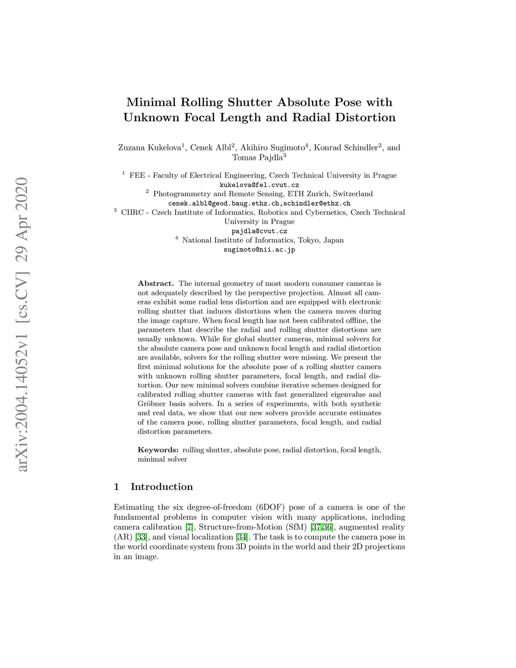 The internal geometry of most modern consumer cameras is not adequately described by the perspective projection. Almost all cameras exhibit some radial lens distortion and are equipped with an electronic rolling shutter that induces distortions when the camera moves during the image capture. When focal length has not been calibrated offline, the parameters that describe the radial and rolling shutter distortions are usually unknown. While for global shutter cameras, minimal solvers for the absolute camera pose and unknown focal length and radial distortion are available, solvers for the rolling shutter were missing. We present the first minimal solutions for the absolute pose of a rolling shutter camera with unknown rolling shutter parameters, focal length, and radial distortion. Our new minimal solvers combine iterative schemes designed for calibrated rolling shutter cameras with fast generalized eigenvalue and Groebner basis solvers. In a series of experiments, with both synthetic and real data, we show that our new solvers provide accurate estimates of the camera pose, rolling shutter parameters, focal length, and radial distortion parameters.