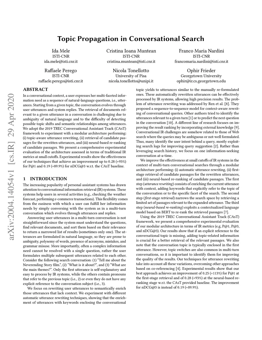 In a conversational context, a user expresses her multi-faceted information need as a sequence of natural-language questions, i.e., utterances. Starting from a given topic, the conversation evolves through user utterances and system replies. The retrieval of documents relevant to a given utterance in a conversation is challenging due to ambiguity of natural language and to the difficulty of detecting possible topic shifts and semantic relationships among utterances. We adopt the 2019 TREC Conversational Assistant Track (CAsT) framework to experiment with a modular architecture performing: (i) topic-aware utterance rewriting, (ii) retrieval of candidate passages for the rewritten utterances, and (iii) neural-based re-ranking of candidate passages. We present a comprehensive experimental evaluation of the architecture assessed in terms of traditional IR metrics at small cutoffs. Experimental results show the effectiveness of our techniques that achieve an improvement up to 0.28 (+93%) for P@1 and 0.19 (+89.9%) for nDCG@3 w.r.t. the CAsT baseline.