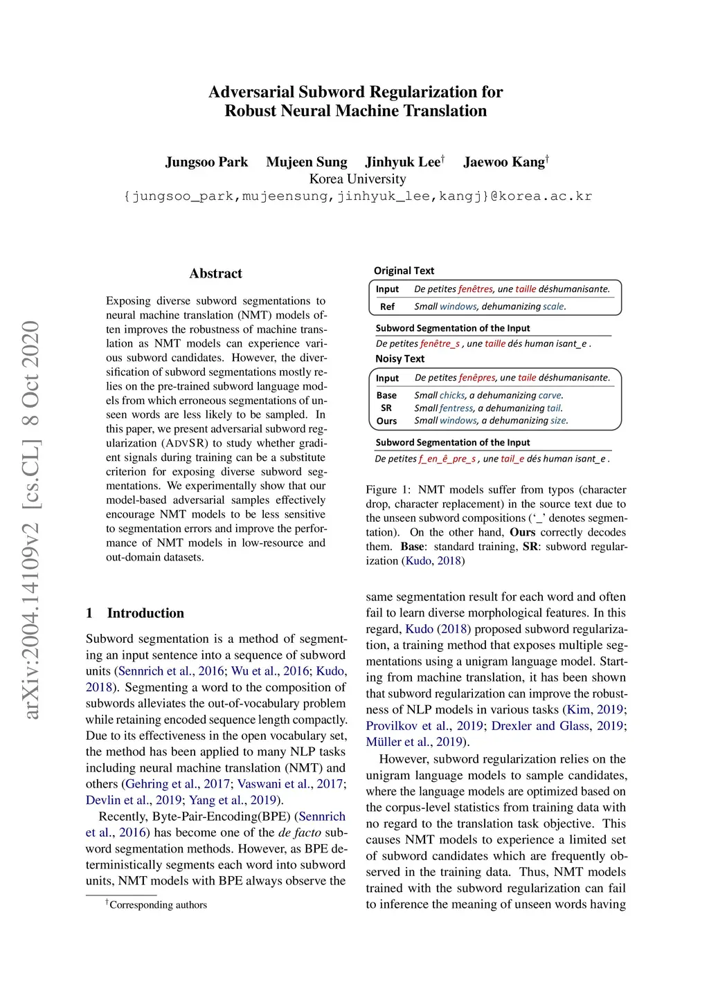 Adversarial Subword Regularization for Robust Neural Machine Translation