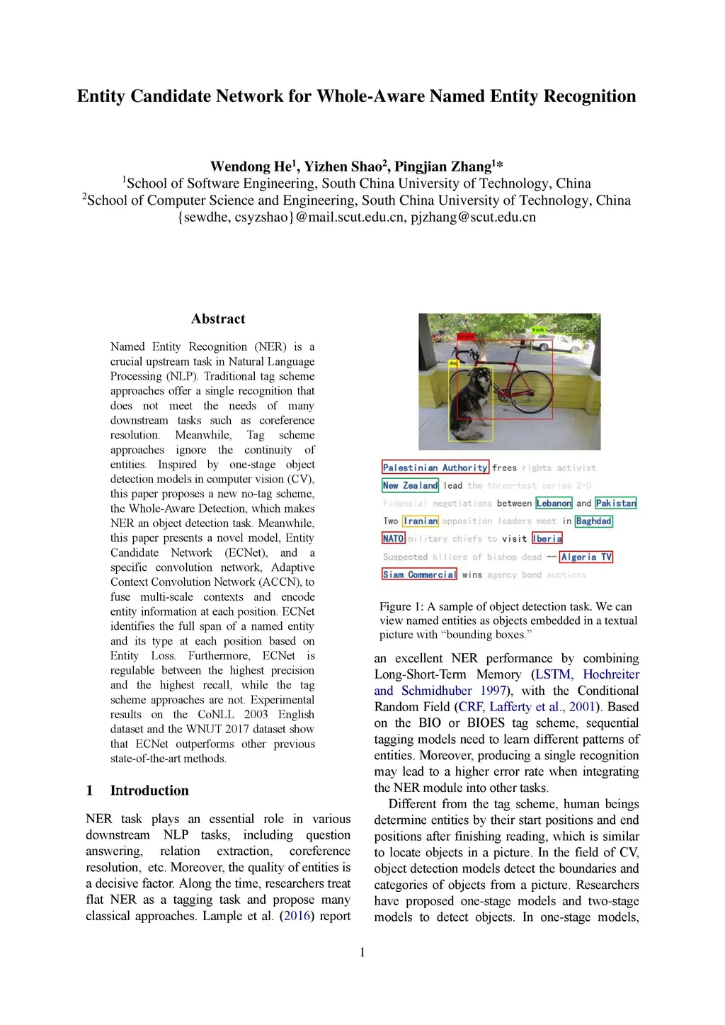 Named Entity Recognition (NER) is a crucial upstream task in Natural Language Processing (NLP). Traditional tag scheme approaches offer a single recognition that does not meet the needs of many downstream tasks such as coreference resolution. Meanwhile, Tag scheme approaches ignore the continuity of entities. Inspired by one-stage object detection models in computer vision (CV), this paper proposes a new no-tag scheme, the Whole-Aware Detection, which makes NER an object detection task. Meanwhile, this paper presents a novel model, Entity Candidate Network (ECNet), and a specific convolution network, Adaptive Context Convolution Network (ACCN), to fuse multi-scale contexts and encode entity information at each position. ECNet identifies the full span of a named entity and its type at each position based on Entity Loss. Furthermore, ECNet is regulable between the highest precision and the highest recall, while the tag scheme approaches are not. Experimental results on the CoNLL 2003 English dataset and the WNUT 2017 dataset show that ECNet outperforms other previous state-of-the-art methods.