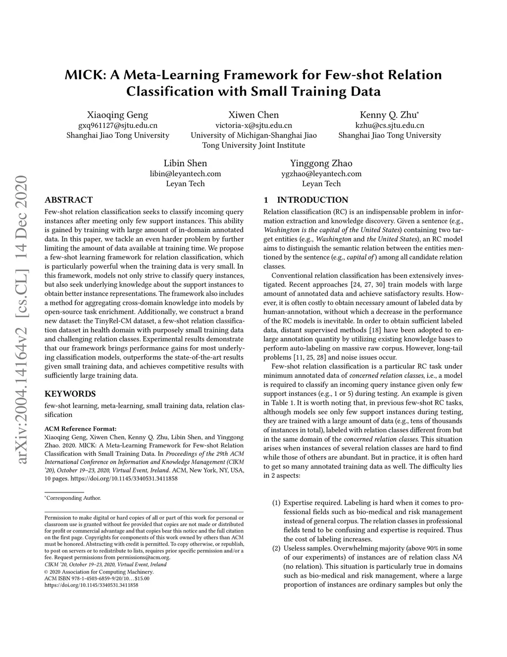 MICK: A Meta-Learning Framework for Few-shot Relation Classification