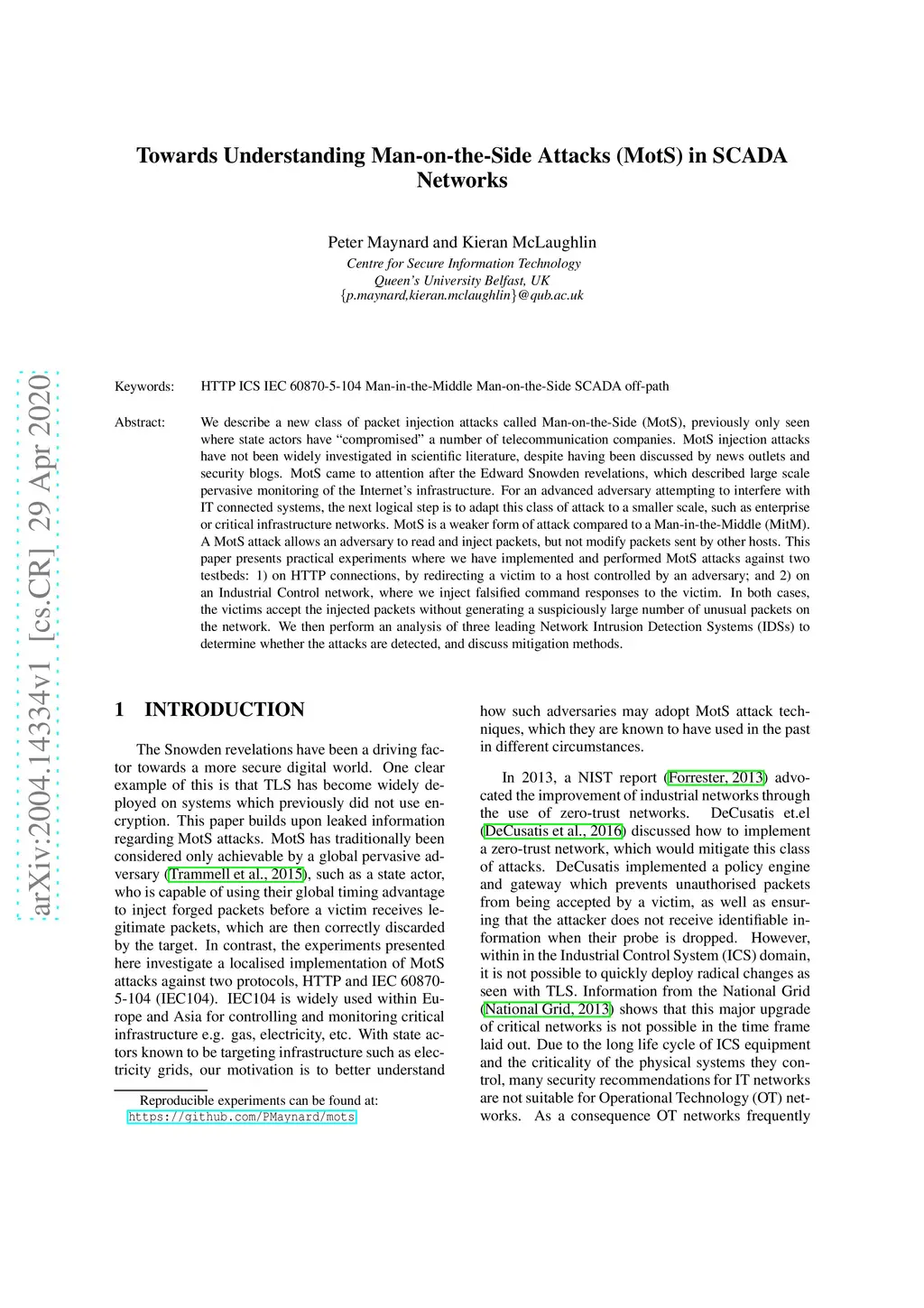 Towards Understanding Man-on-the-Side Attacks (MotS) in SCADA Networks