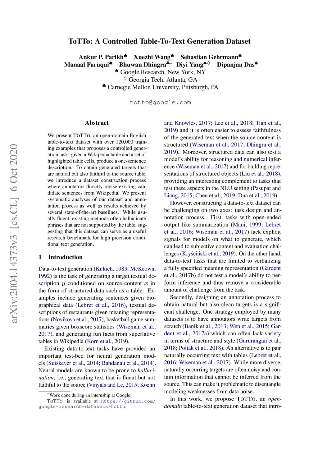 ToTTo: A Controlled Table-To-Text Generation Dataset
