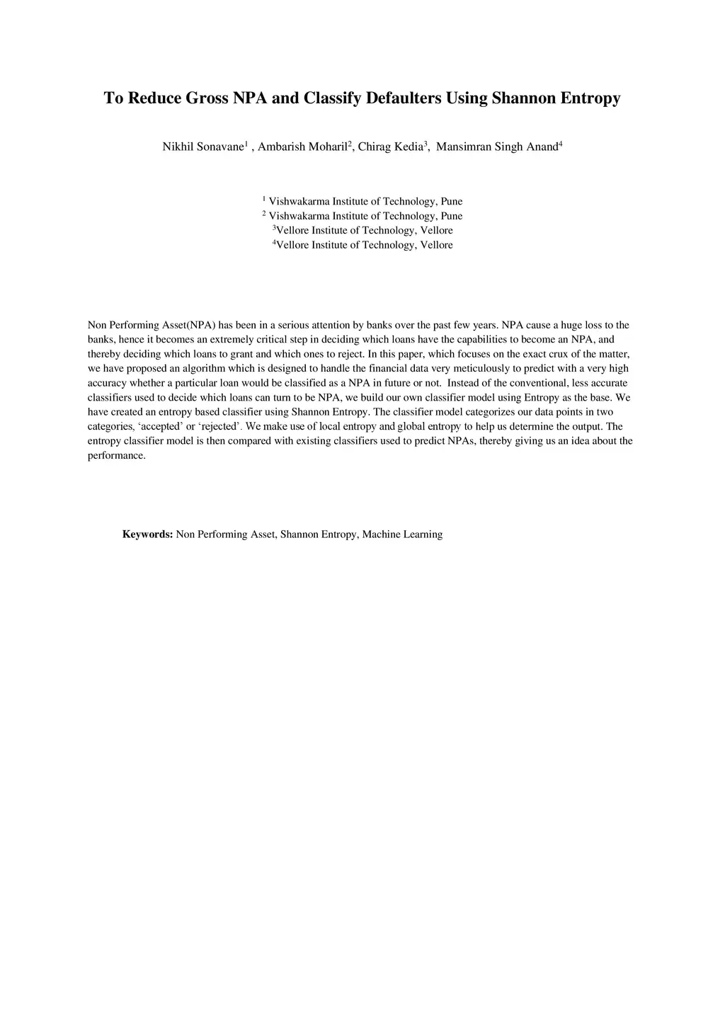 Non Performing Asset(NPA) has been in a serious attention by banks over the past few years. NPA cause a huge loss to the banks hence it becomes an extremely critical step in deciding which loans have the capabilities to become an NPA and thereby deciding which loans to grant and which ones to reject. In this paper which focuses on the exact crux of the matter we have proposed an algorithm which is designed to handle the financial data very meticulously to predict with a very high accuracy whether a particular loan would be classified as a NPA in future or not. Instead of the conventional less accurate classifiers used to decide which loans can turn to be NPA we build our own classifier model using Entropy as the base. We have created an entropy based classifier using Shannon Entropy. The classifier model categorizes our data points in two categories accepted or rejected. We make use of local entropy and global entropy to help us determine the output. The entropy classifier model is then compared with existing classifiers used to predict NPAs thereby giving us an idea about the performance.